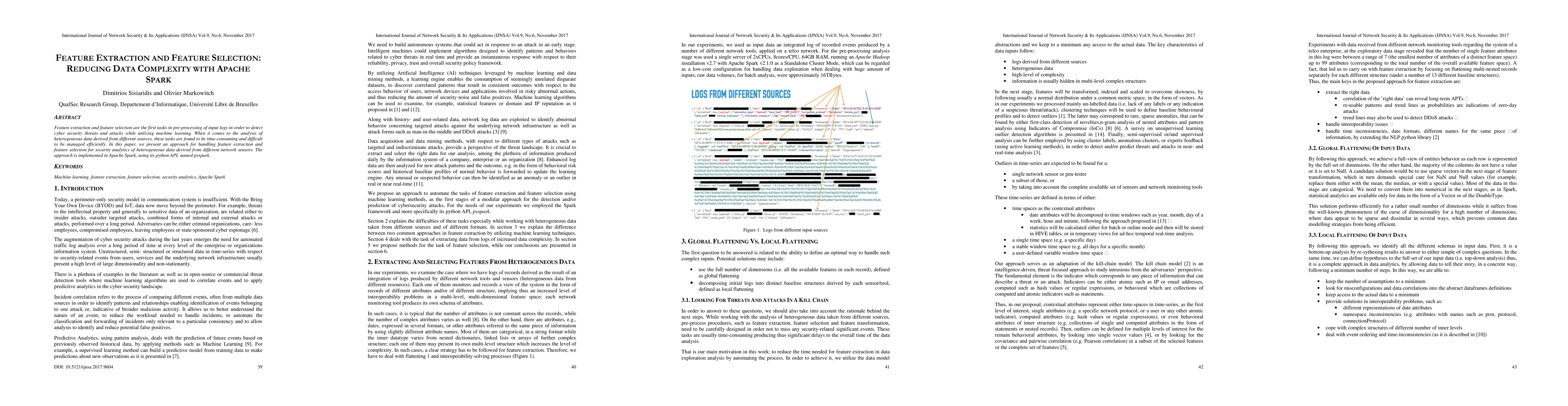 Feature extraction and feature selection are the first tasks in pre-processing of input logs in order to detect cyber security threats and attacks while utilizing machine learning. When it comes to the analysis of heterogeneous data derived from different sources, these tasks are found to be time-consuming and difficult to be managed efficiently. In this paper, we present an approach for handling feature extraction and feature selection for security analytics of heterogeneous data derived from different network sensors. The approach is implemented in Apache Spark, using its python API, named pyspark.