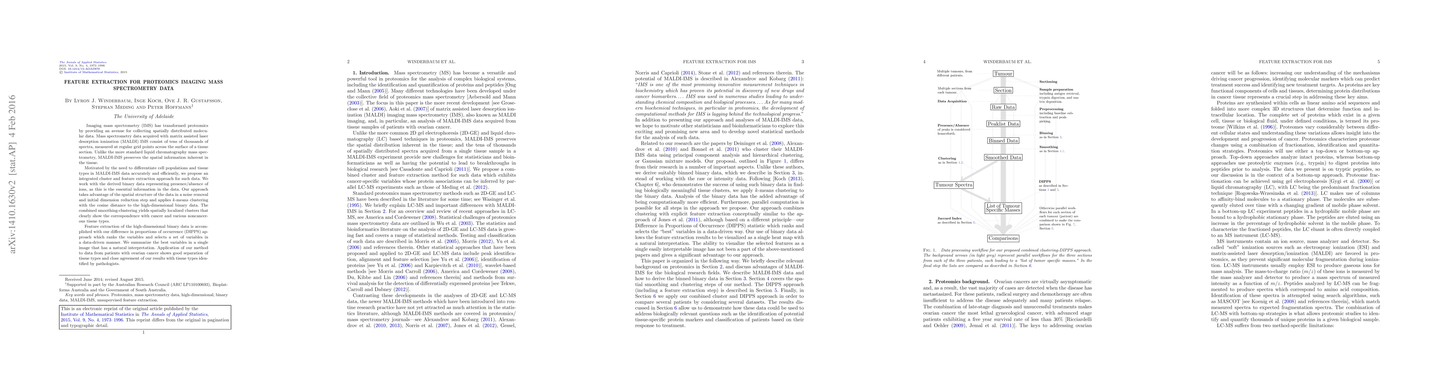 This paper proposes an integrated clustering and feature extraction method for MALDI-IMS data to differentiate tissue types in proteomics. The approach uses spatial structure for noise reduction and applies $k$-means clustering, followed by a DIPPS feature extraction method to identify significant variables, demonstrating effective tissue type separation in ovarian cancer data.