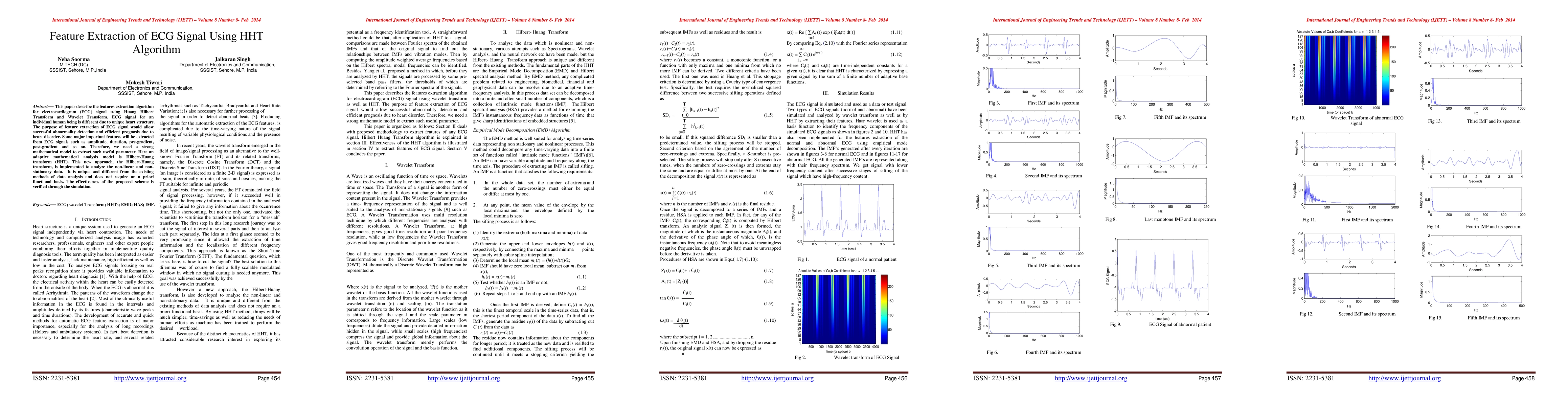 This paper proposes a feature extraction algorithm for ECG signals using the Hilbert-Huang Transform (HHT) and Wavelet Transform to identify unique heart structure-related parameters, facilitating effective detection of abnormalities and prognosis of heart disorders. The HHT method is shown to be effective in analyzing non-linear and nonstationary data without requiring a predefined functional basis.