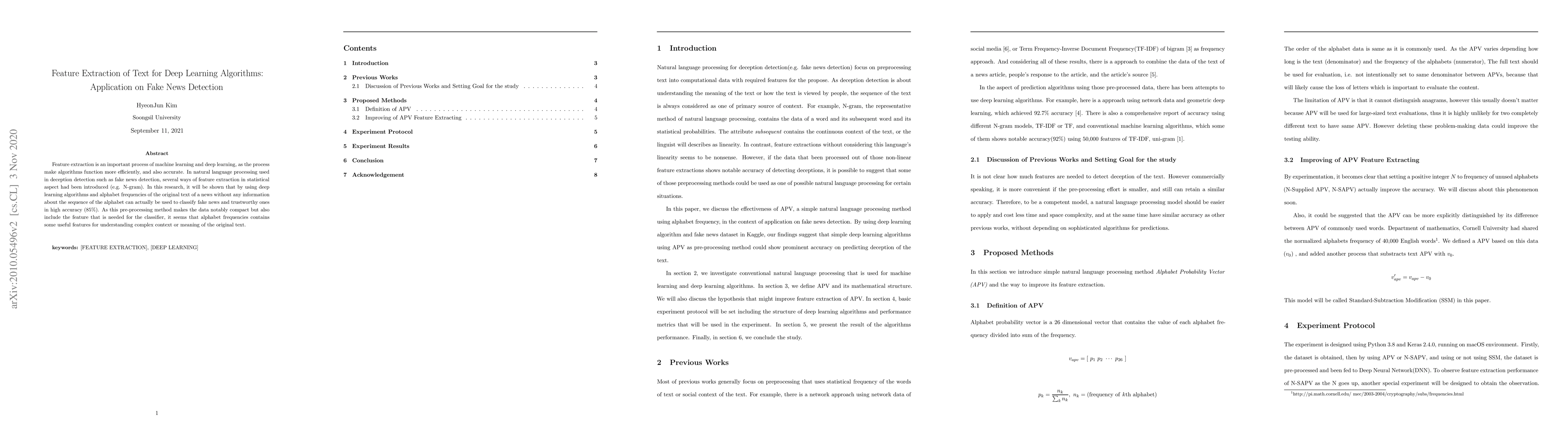 This research explores feature extraction methods for deep learning in detecting fake news, demonstrating that alphabet frequencies in text can classify fake and real news with 85% accuracy. This approach compacts data while retaining essential features, suggesting that alphabet frequencies hold valuable context clues.