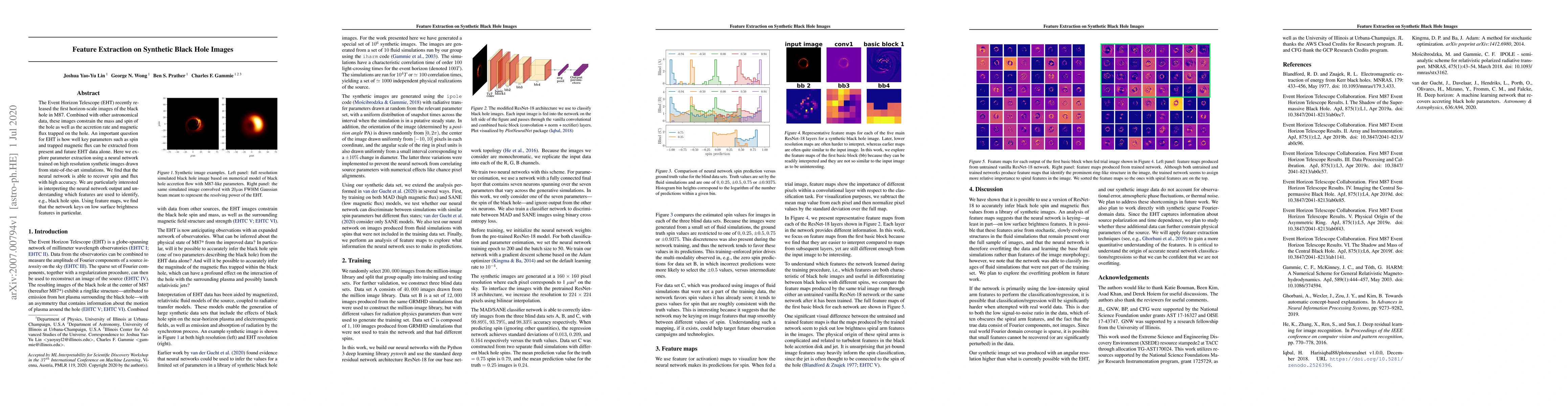 The Event Horizon Telescope (EHT) recently released the first horizon-scale images of the black hole in M87. Combined with other astronomical data, these images constrain the mass and spin of the hole as well as the accretion rate and magnetic flux trapped on the hole. An important question for EHT is how well key parameters such as spin and trapped magnetic flux can be extracted from present and future EHT data alone. Here we explore parameter extraction using a neural network trained on high resolution synthetic images drawn from state-of-the-art simulations. We find that the neural network is able to recover spin and flux with high accuracy. We are particularly interested in interpreting the neural network output and understanding which features are used to identify, e.g., black hole spin. Using feature maps, we find that the network keys on low surface brightness features in particular.