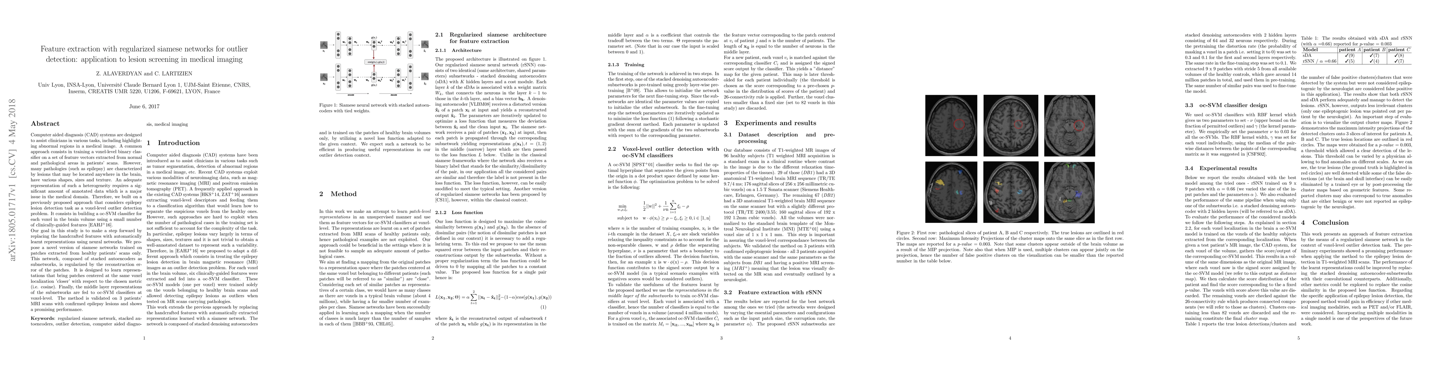 Computer aided diagnosis (CAD) systems are designed to assist clinicians in various tasks, including highlighting abnormal regions in a medical image. A common approach consists in training a voxel-level binary classifier on a set of feature vectors extracted from normal and pathological areas in patients' scans. However, many pathologies (such as epilepsy) are characterized by lesions that may be located anywhere in the brain, have various shapes, sizes and texture. An adequate representation of such a heterogeneity requires a significant amount of annotated data which is a major issue in the medical domain. Therefore, we built on a previously proposed approach that considers epilepsy lesion detection task as a voxel-level outlier detection problem. It consists in building a oc-SVM classifier for each voxel in the brain volume using a small number of clinically-guided features El Azami et al., 2016. Our goal in this study is to make a step forward by replacing the handcrafted features with automatically learnt representations using neural networks. We propose a novel version of siamese networks trained on patches extracted from healthy patients' scans only. This network, composed of stacked autoencoders as subnetworks, is regularized by the reconstruction error of the patches. It is designed to learn representations that bring patches centered at the same voxel localization 'closer' with respect to the chosen metric (i.e. cosine). Finally, the middle layer representations of the subnetworks are fed to oc-SVM classifiers at voxel-level. The method is validated on 3 patients' MRI scans with confirmed epilepsy lesions and shows a promising performance.