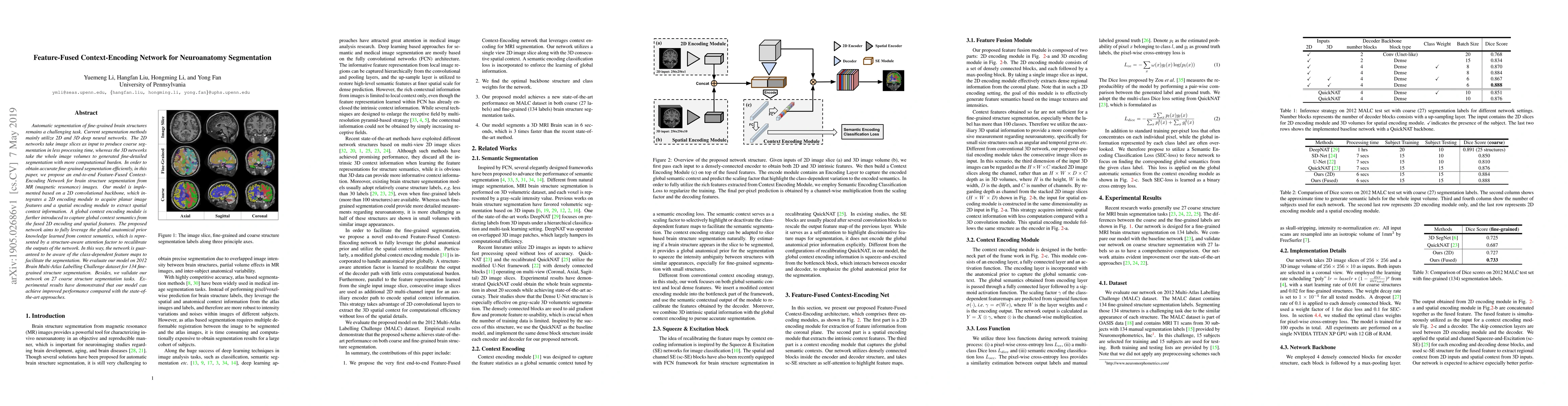 The paper proposes a Feature-Fused Context-Encoding Network (FF-CEN) for neuroanatomy segmentation from MR images using a 2D convolutional backbone with 2D encoding, spatial encoding, and global context encoding modules.