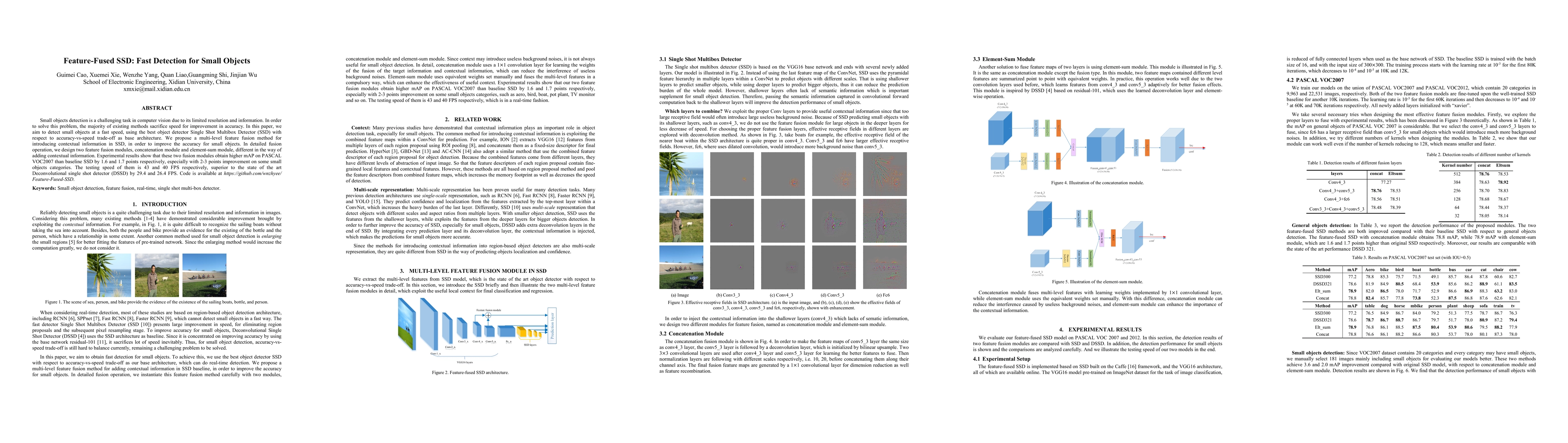 This paper proposes a multi-level feature fusion method to enhance the Single Shot Multibox Detector (SSD) for fast detection of small objects, achieving higher accuracy with 1.6-1.7 points improvement in mAP on PASCALVOC2007 while maintaining a speed of 43-40 FPS, outperforming the state-of-the-art DSSD.