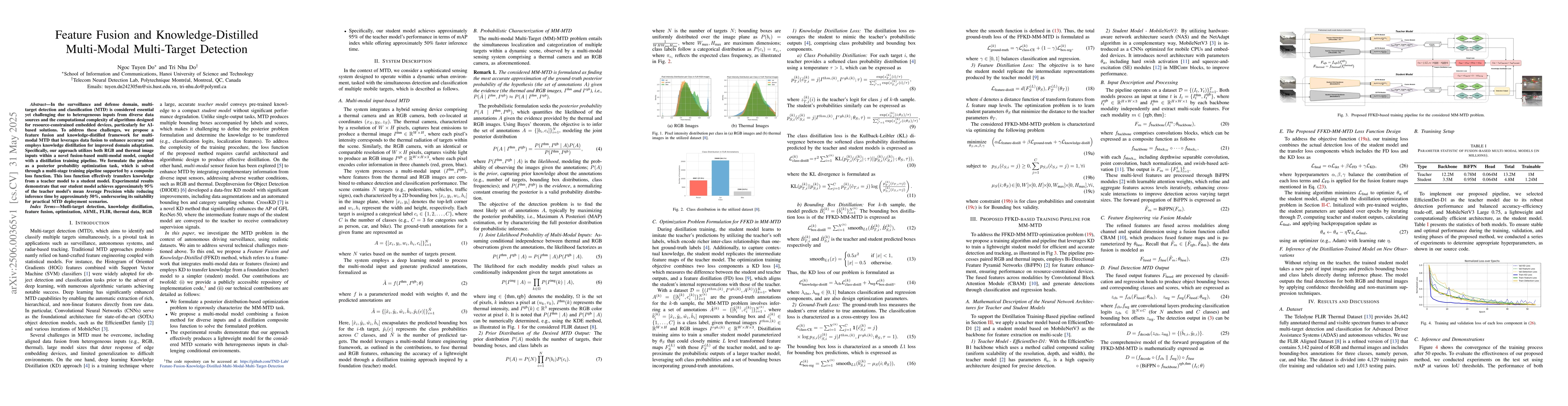 In the surveillance and defense domain, multi-target detection and classification (MTD) is considered essential yet challenging due to heterogeneous inputs from diverse data sources and the computational complexity of algorithms designed for resource-constrained embedded devices, particularly for Al-based solutions. To address these challenges, we propose a feature fusion and knowledge-distilled framework for multi-modal MTD that leverages data fusion to enhance accuracy and employs knowledge distillation for improved domain adaptation. Specifically, our approach utilizes both RGB and thermal image inputs within a novel fusion-based multi-modal model, coupled with a distillation training pipeline. We formulate the problem as a posterior probability optimization task, which is solved through a multi-stage training pipeline supported by a composite loss function. This loss function effectively transfers knowledge from a teacher model to a student model. Experimental results demonstrate that our student model achieves approximately 95% of the teacher model's mean Average Precision while reducing inference time by approximately 50%, underscoring its suitability for practical MTD deployment scenarios.
