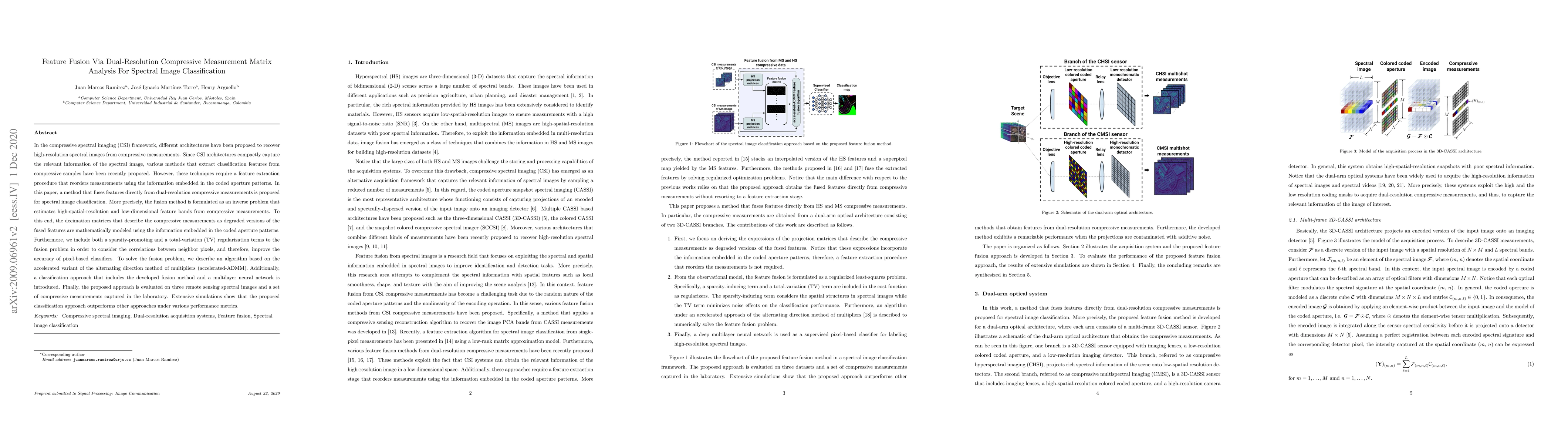 This paper proposes a method for spectral image classification using feature fusion from dual-resolution compressive measurements. It introduces an inverse problem to estimate high-resolution features and employs an accelerated-ADMM algorithm for solving it, achieving superior classification performance compared to other methods.