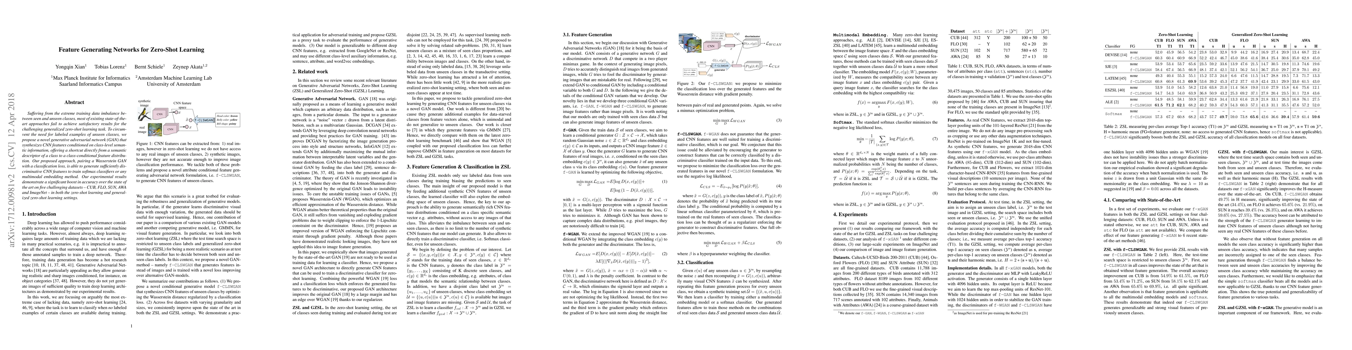 This paper proposes a novel GAN to generate CNN features for zero-shot learning, synthesizing features from class-level semantic information to address data imbalance. The approach combines a Wasserstein GAN with a classification loss, achieving significant accuracy improvements on multiple datasets.
