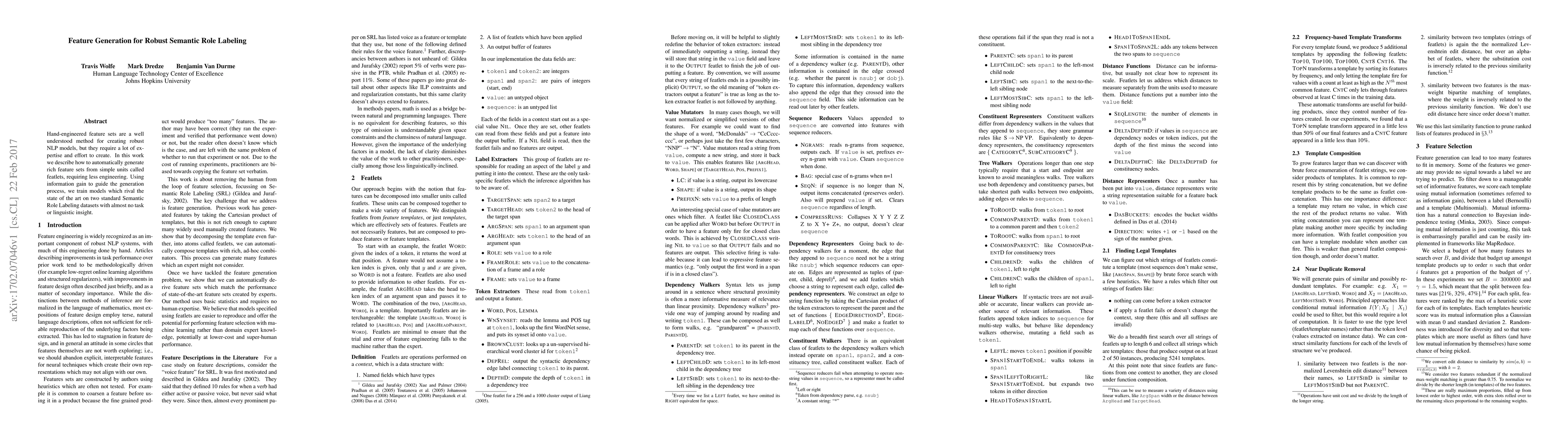 Hand-engineered feature sets are a well understood method for creating robust NLP models, but they require a lot of expertise and effort to create. In this work we describe how to automatically generate rich feature sets from simple units called featlets, requiring less engineering. Using information gain to guide the generation process, we train models which rival the state of the art on two standard Semantic Role Labeling datasets with almost no task or linguistic insight.