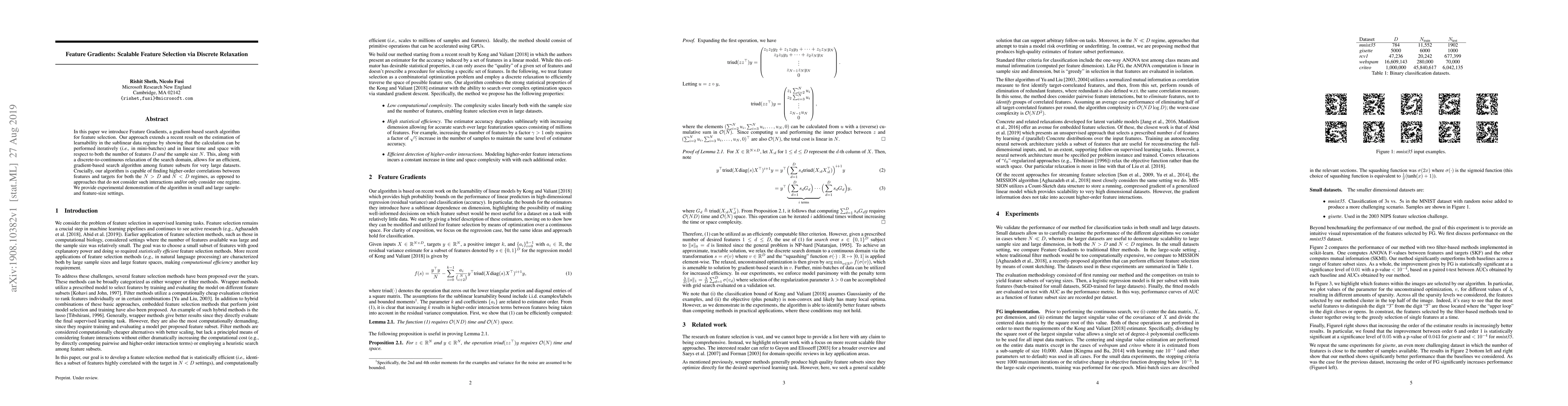 In this paper we introduce Feature Gradients, a gradient-based search algorithm for feature selection. Our approach extends a recent result on the estimation of learnability in the sublinear data regime by showing that the calculation can be performed iteratively (i.e., in mini-batches) and in linear time and space with respect to both the number of features D and the sample size N . This, along with a discrete-to-continuous relaxation of the search domain, allows for an efficient, gradient-based search algorithm among feature subsets for very large datasets. Crucially, our algorithm is capable of finding higher-order correlations between features and targets for both the N > D and N < D regimes, as opposed to approaches that do not consider such interactions and/or only consider one regime. We provide experimental demonstration of the algorithm in small and large sample-and feature-size settings.