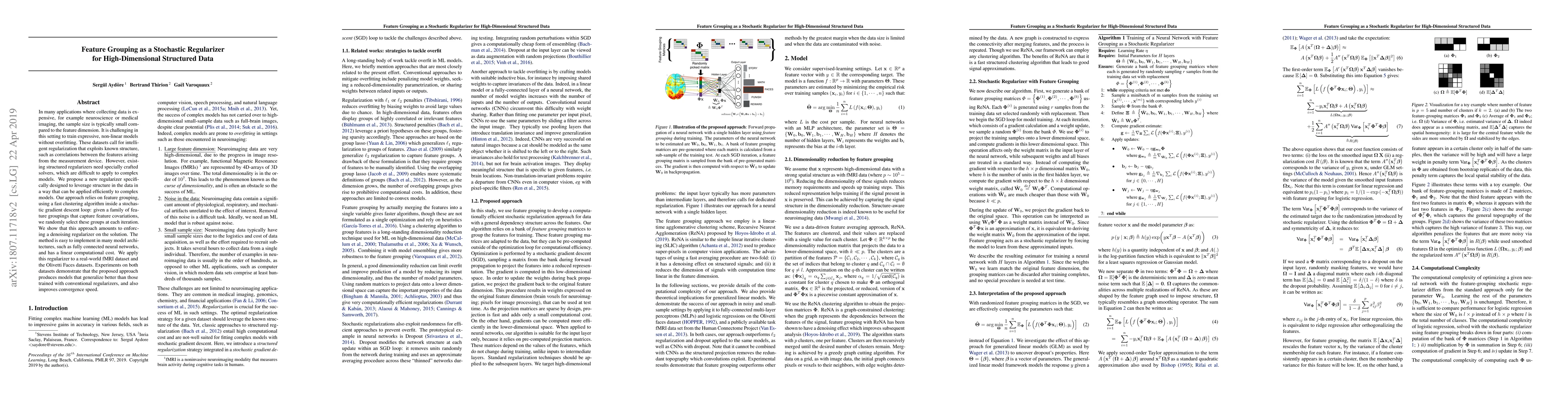 In many applications where collecting data is expensive, for example neuroscience or medical imaging, the sample size is typically small compared to the feature dimension. It is challenging in this setting to train expressive, non-linear models without overfitting. These datasets call for intelligent regularization that exploits known structure, such as correlations between the features arising from the measurement device. However, existing structured regularizers need specially crafted solvers, which are difficult to apply to complex models. We propose a new regularizer specifically designed to leverage structure in the data in a way that can be applied efficiently to complex models. Our approach relies on feature grouping, using a fast clustering algorithm inside a stochastic gradient descent loop: given a family of feature groupings that capture feature covariations, we randomly select these groups at each iteration. We show that this approach amounts to enforcing a denoising regularizer on the solution. The method is easy to implement in many model architectures, such as fully connected neural networks, and has a linear computational cost. We apply this regularizer to a real-world fMRI dataset and the Olivetti Faces datasets. Experiments on both datasets demonstrate that the proposed approach produces models that generalize better than those trained with conventional regularizers, and also improves convergence speed.