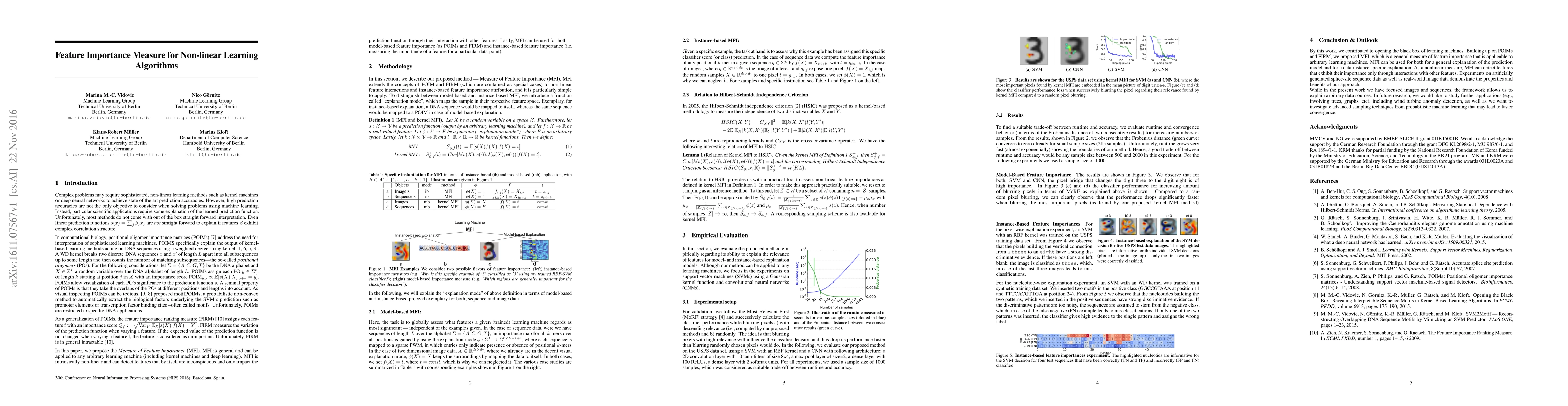 This paper introduces the Measure of Feature Importance (MFI) to interpret non-linear learning algorithms like kernel machines and deep neural networks. MFI identifies features' significance, even those that only impact predictions through interactions, and can be used for both model-based and instance-based feature importance.