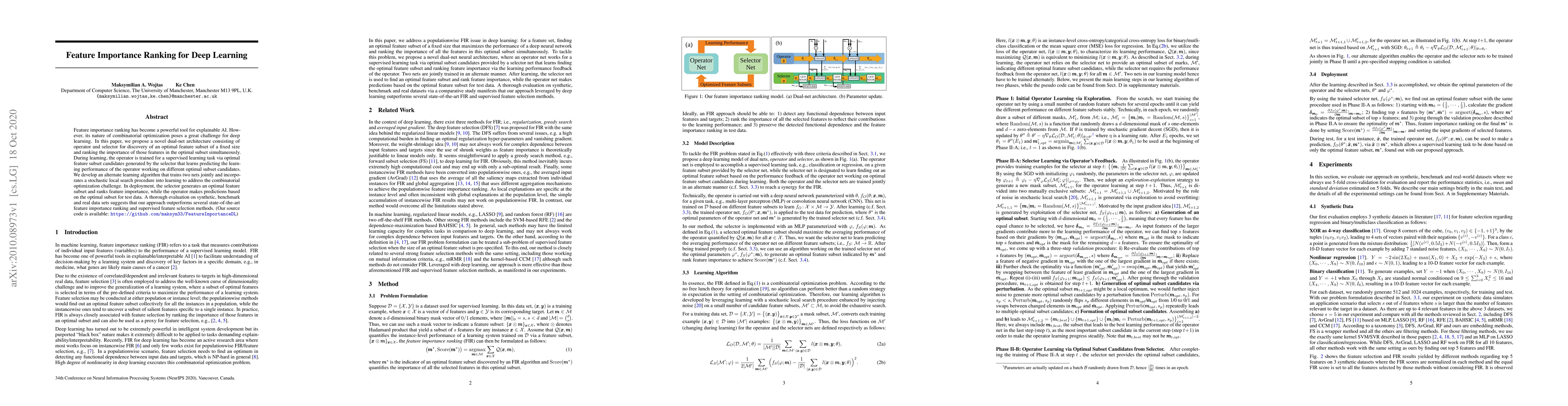 The paper proposes a dual-net architecture consisting of an operator and a selector for simultaneous discovery of an optimal feature subset and ranking their importance. The architecture uses an alternate learning algorithm that trains two nets jointly and incorporates a stochastic local search procedure to tackle combinatorial optimization challenges.