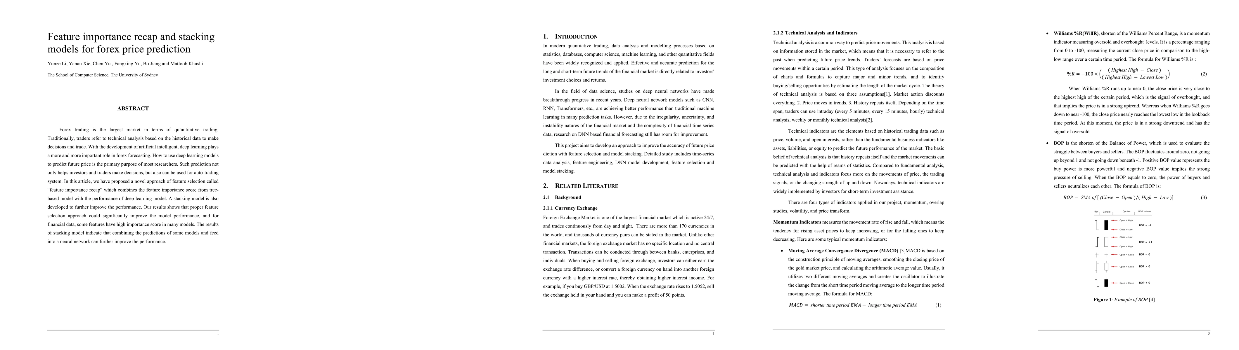 Forex trading is the largest market in terms of qutantitative trading. Traditionally, traders refer to technical analysis based on the historical data to make decisions and trade. With the development of artificial intelligent, deep learning plays a more and more important role in forex forecasting. How to use deep learning models to predict future price is the primary purpose of most researchers. Such prediction not only helps investors and traders make decisions, but also can be used for auto-trading system. In this article, we have proposed a novel approach of feature selection called 'feature importance recap' which combines the feature importance score from tree-based model with the performance of deep learning model. A stacking model is also developed to further improve the performance. Our results shows that proper feature selection approach could significantly improve the model performance, and for financial data, some features have high importance score in many models. The results of stacking model indicate that combining the predictions of some models and feed into a neural network can further improve the performance.