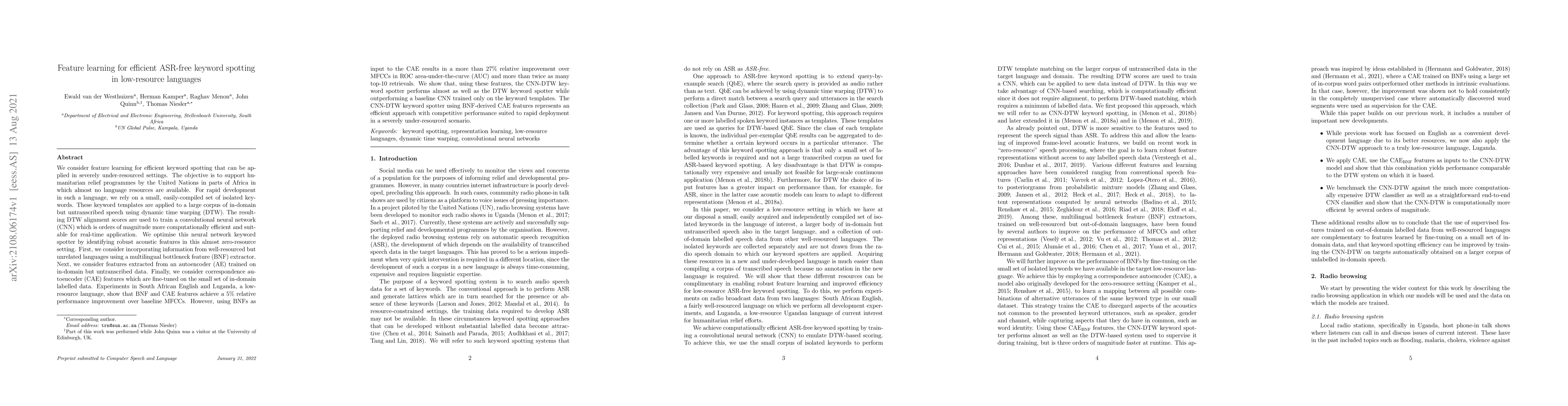 This research explores feature learning techniques for efficient keyword spotting in low-resource languages, aiming to support humanitarian relief programs in Africa. The study employs dynamic time warping and convolutional neural networks to develop a computationally efficient real-time keyword spotter, optimizing it with robust acoustic features like multilingual bottleneck features and correspondence autoencoder features. The results show significant improvements in performance, making the approach highly suitable for rapid deployment in under-resourced settings.
