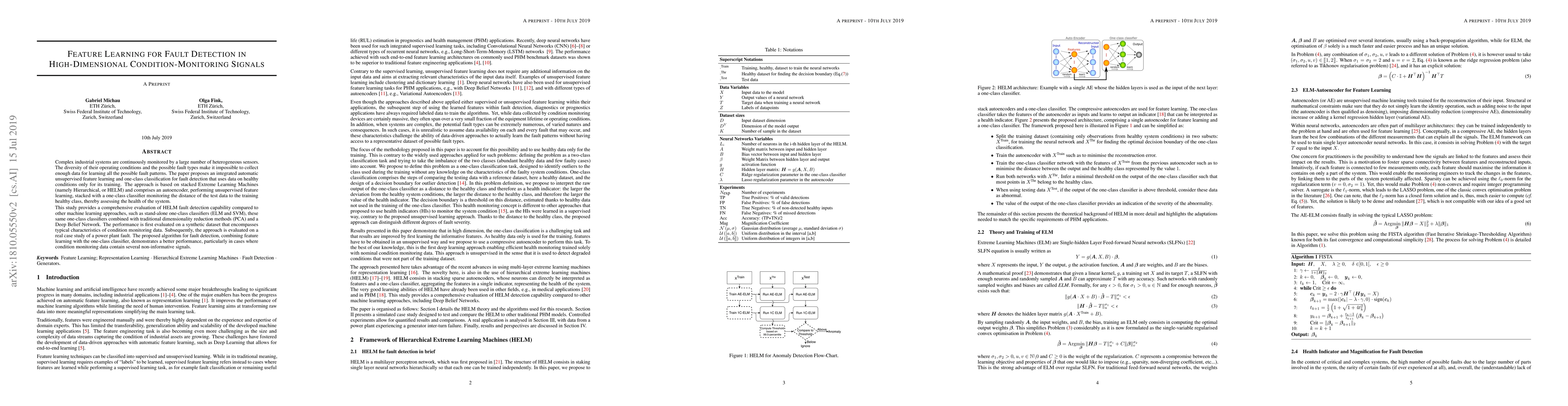 This paper proposes an unsupervised feature learning and one-class classification method using stacked Extreme Learning Machines (HELM) for fault detection in high-dimensional condition-monitoring signals. The HELM approach, combining autoencoders and one-class classifiers, outperforms other methods on both synthetic and real-world power plant data.
