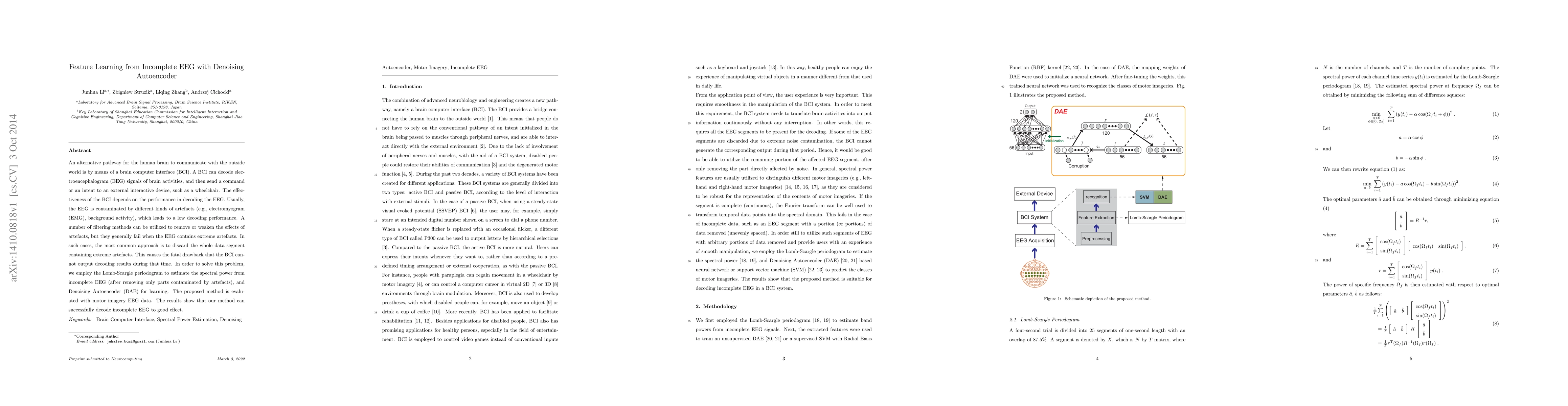 An alternative pathway for the human brain to communicate with the outside world is by means of a brain computer interface (BCI). A BCI can decode electroencephalogram (EEG) signals of brain activities, and then send a command or an intent to an external interactive device, such as a wheelchair. The effectiveness of the BCI depends on the performance in decoding the EEG. Usually, the EEG is contaminated by different kinds of artefacts (e.g., electromyogram (EMG), background activity), which leads to a low decoding performance. A number of filtering methods can be utilized to remove or weaken the effects of artefacts, but they generally fail when the EEG contains extreme artefacts. In such cases, the most common approach is to discard the whole data segment containing extreme artefacts. This causes the fatal drawback that the BCI cannot output decoding results during that time. In order to solve this problem, we employ the Lomb-Scargle periodogram to estimate the spectral power from incomplete EEG (after removing only parts contaminated by artefacts), and Denoising Autoencoder (DAE) for learning. The proposed method is evaluated with motor imagery EEG data. The results show that our method can successfully decode incomplete EEG to good effect.