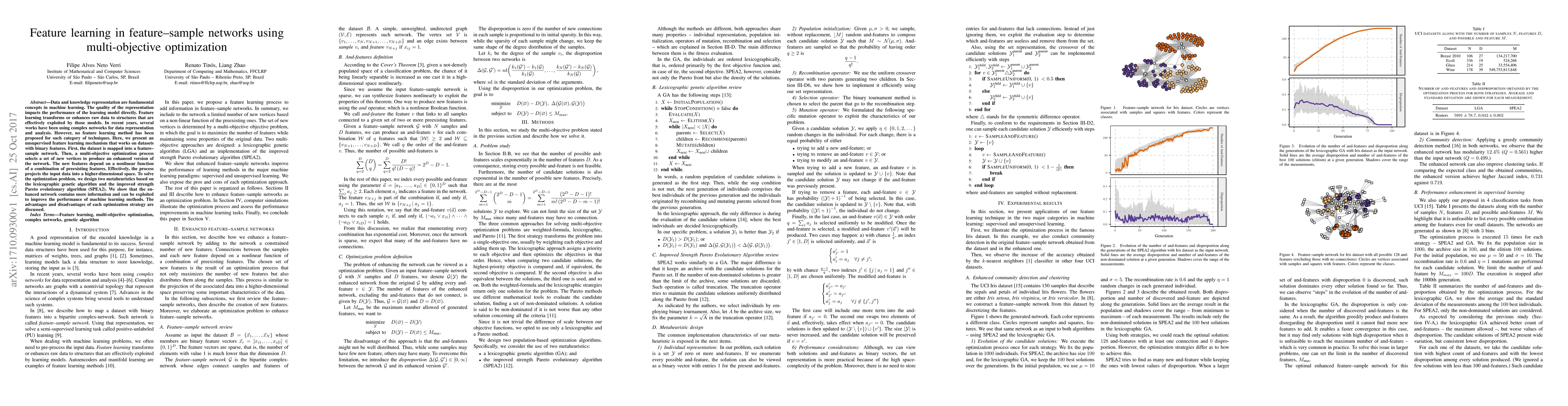 Data and knowledge representation are fundamental concepts in machine learning. The quality of the representation impacts the performance of the learning model directly. Feature learning transforms or enhances raw data to structures that are effectively exploited by those models. In recent years, several works have been using complex networks for data representation and analysis. However, no feature learning method has been proposed for such category of techniques. Here, we present an unsupervised feature learning mechanism that works on datasets with binary features. First, the dataset is mapped into a feature--sample network. Then, a multi-objective optimization process selects a set of new vertices to produce an enhanced version of the network. The new features depend on a nonlinear function of a combination of preexisting features. Effectively, the process projects the input data into a higher-dimensional space. To solve the optimization problem, we design two metaheuristics based on the lexicographic genetic algorithm and the improved strength Pareto evolutionary algorithm (SPEA2). We show that the enhanced network contains more information and can be exploited to improve the performance of machine learning methods. The advantages and disadvantages of each optimization strategy are discussed.