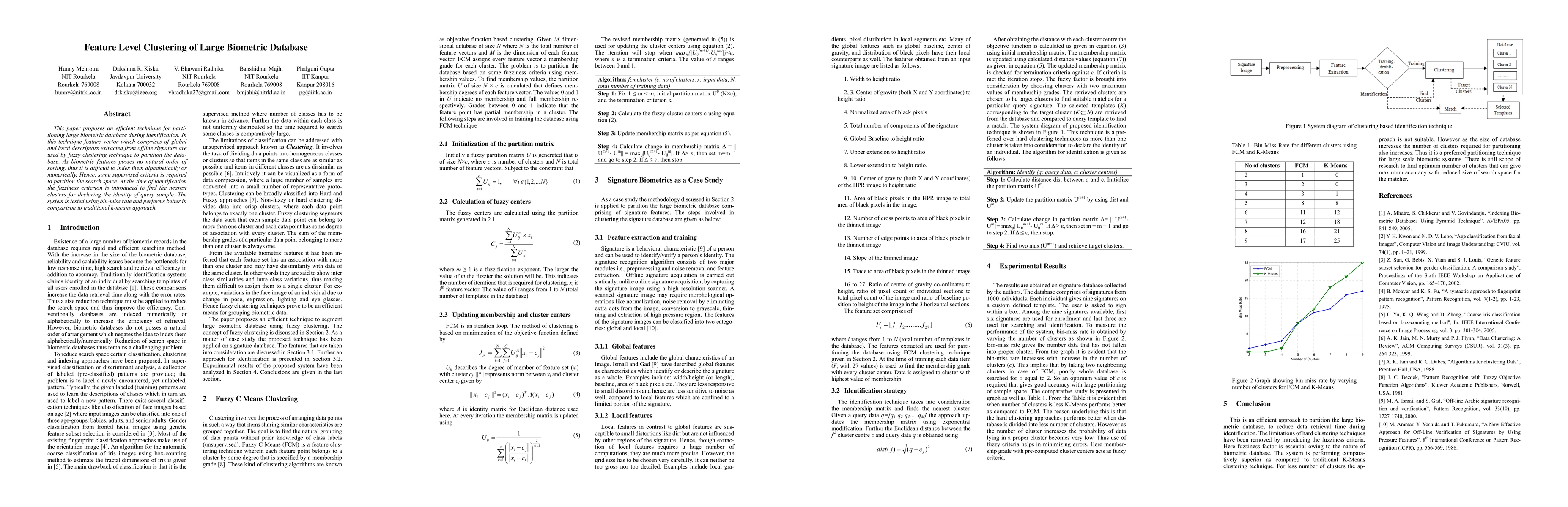This paper proposes an efficient technique for partitioning large biometric database during identification. In this technique feature vector which comprises of global and local descriptors extracted from offline signature are used by fuzzy clustering technique to partition the database. As biometric features posses no natural order of sorting, thus it is difficult to index them alphabetically or numerically. Hence, some supervised criteria is required to partition the search space. At the time of identification the fuzziness criterion is introduced to find the nearest clusters for declaring the identity of query sample. The system is tested using bin-miss rate and performs better in comparison to traditional k-means approach.