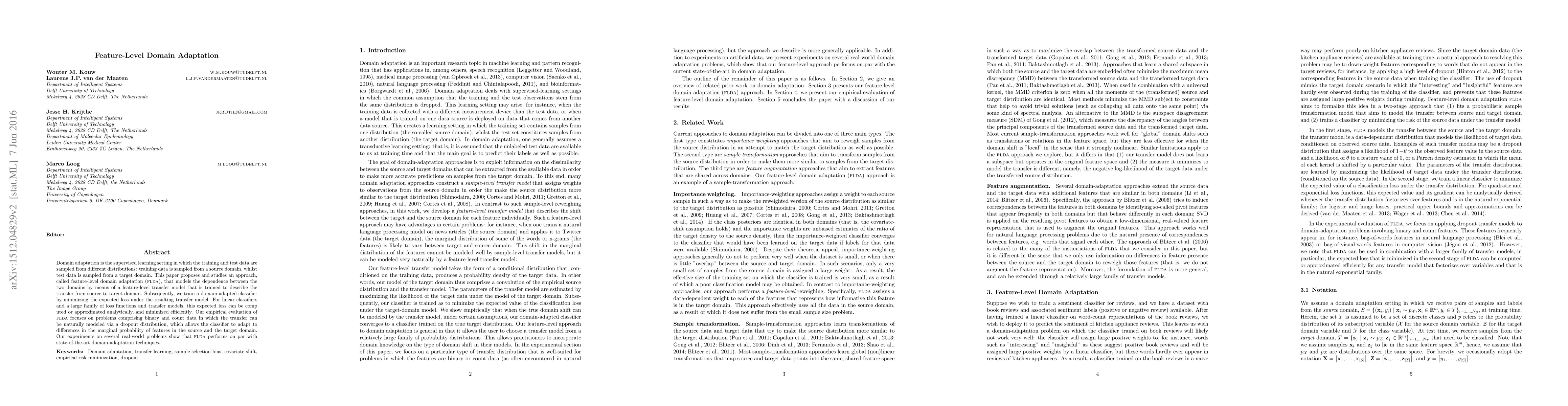 This paper proposes a new approach called Feature-Level Domain Adaptation (FLDA) that enables domain adaptation for binary and count data. FLDA performs on par with state-of-the-art techniques in real-world problems.