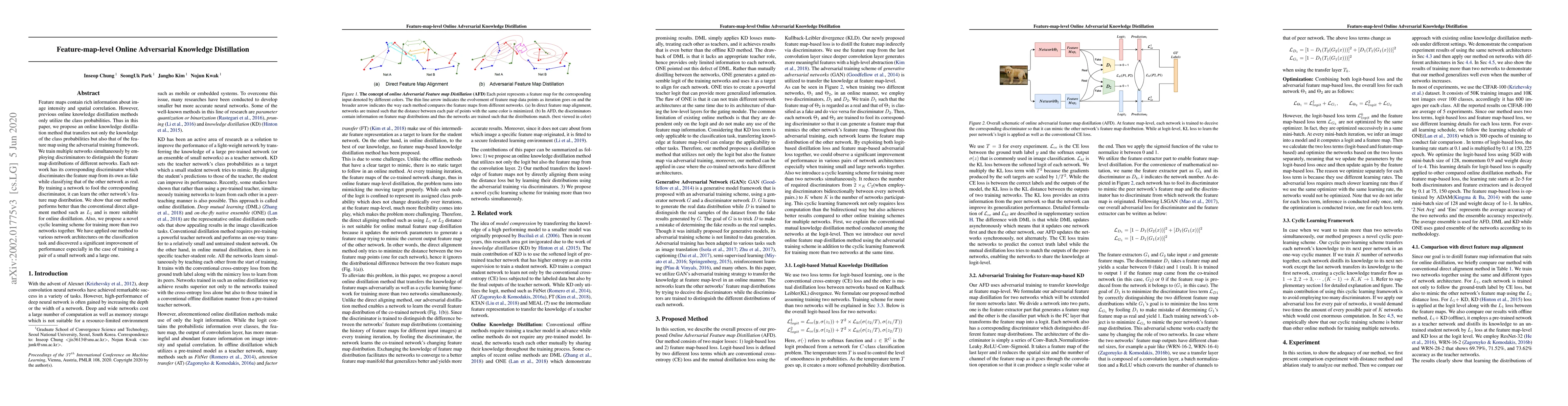 This paper proposes an online adversarial knowledge distillation method that transfers both class probabilities and feature map information, using adversarial training to improve performance. The method employs discriminators to distinguish feature map distributions, leading to better results than conventional alignment methods.