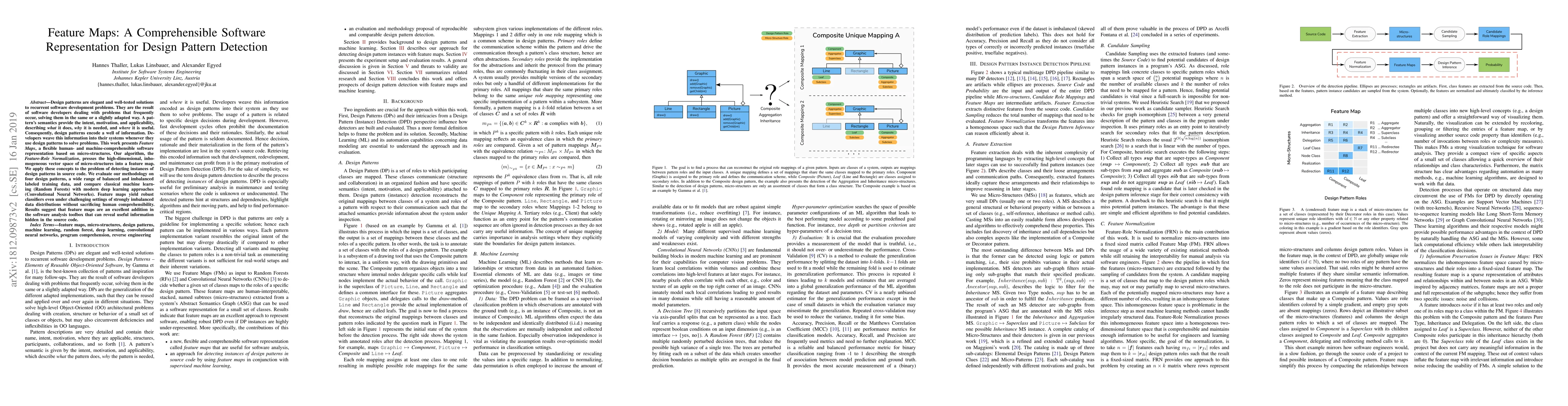Design patterns are elegant and well-tested solutions to recurrent software development problems. They are the result of software developers dealing with problems that frequently occur, solving them in the same or a slightly adapted way. A pattern's semantics provide the intent, motivation, and applicability, describing what it does, why it is needed, and where it is useful. Consequently, design patterns encode a well of information. Developers weave this information into their systems whenever they use design patterns to solve problems. This work presents Feature Maps, a flexible human- and machine-comprehensible software representation based on micro-structures. Our algorithm, the Feature-Role Normalization, presses the high-dimensional, inhomogeneous vector space of micro-structures into a feature map. We apply these concepts to the problem of detecting instances of design patterns in source code. We evaluate our methodology on four design patterns, a wide range of balanced and imbalanced labeled training data, and compare classical machine learning (Random Forests) with modern deep learning approaches (Convolutional Neural Networks). Feature maps yield robust classifiers even under challenging settings of strongly imbalanced data distributions without sacrificing human comprehensibility. Results suggest that feature maps are an excellent addition in the software analysis toolbox that can reveal useful information hidden in the source code.