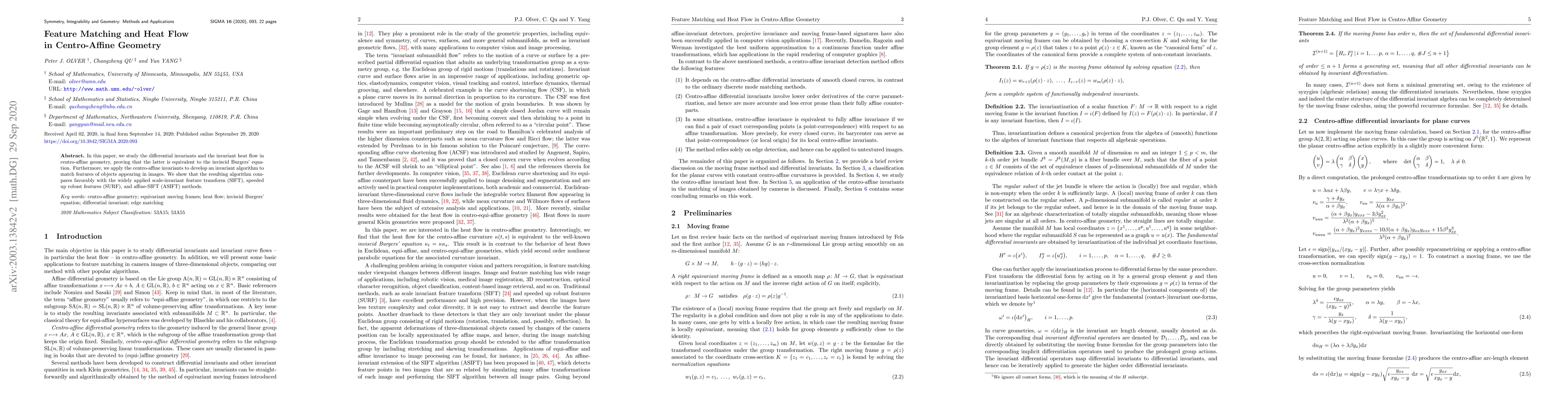 This paper investigates differential invariants and invariant heat flow in centro-affine geometry, demonstrating their equivalence to the inviscid Burgers' equation. It also develops an invariant feature matching algorithm that outperforms SIFT, SURF, and ASIFT methods.