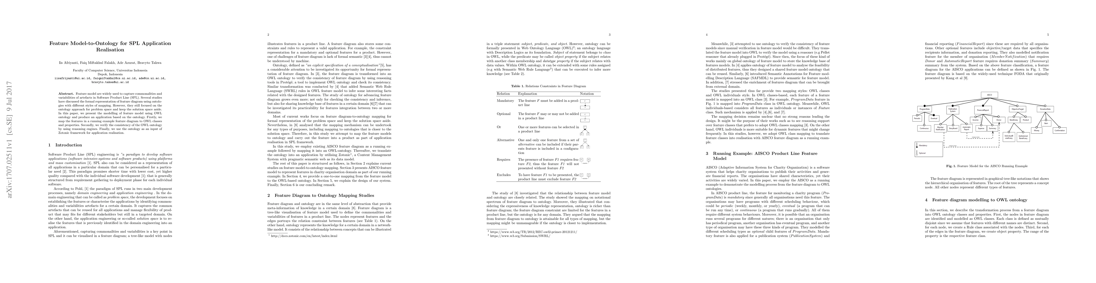 This paper presents a method for mapping feature models to OWL ontologies, enabling application realization in Software Product Lines. It demonstrates the use of ontology-based reasoning to ensure consistency and application realisation using the Zotonic framework.