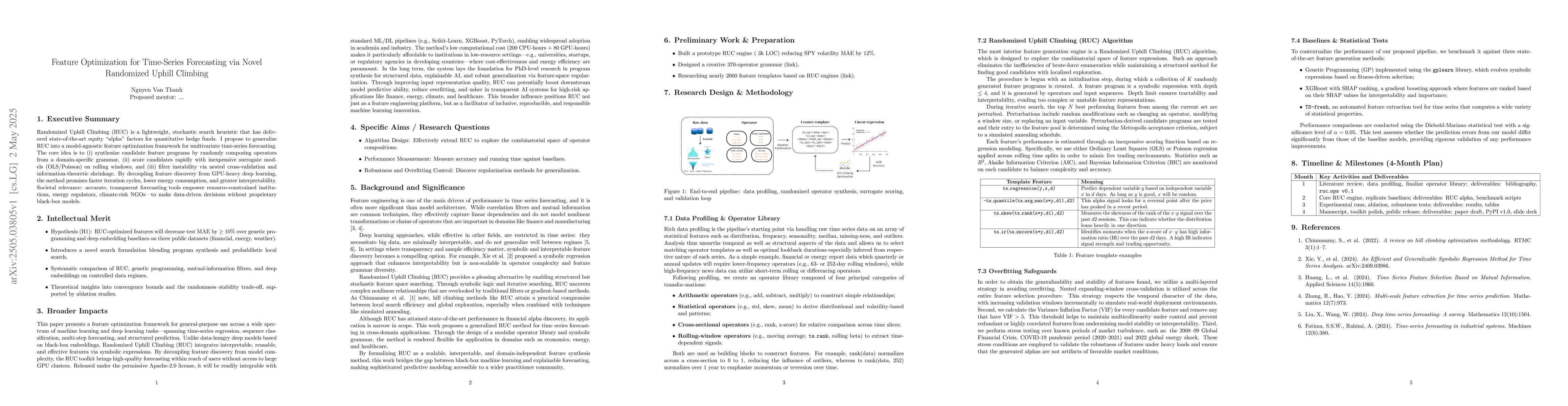 Randomized Uphill Climbing is a lightweight, stochastic search heuristic that has delivered state of the art equity alpha factors for quantitative hedge funds. I propose to generalize RUC into a model agnostic feature optimization framework for multivariate time series forecasting. The core idea is to synthesize candidate feature programs by randomly composing operators from a domain specific grammar, score candidates rapidly with inexpensive surrogate models on rolling windows, and filter instability via nested cross validation and information theoretic shrinkage. By decoupling feature discovery from GPU heavy deep learning, the method promises faster iteration cycles, lower energy consumption, and greater interpretability. Societal relevance: accurate, transparent forecasting tools empower resource constrained institutions, energy regulators, climate risk NGOs to make data driven decisions without proprietary black box models.