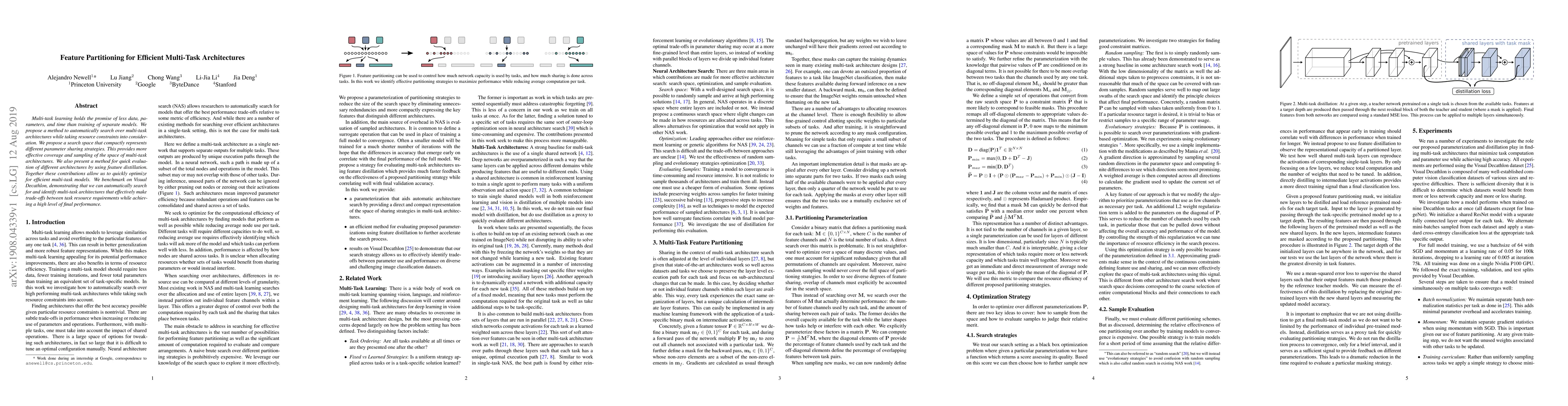 This paper proposes a method for automatically searching over multi-task architectures that considers resource constraints, using a compact search space for parameter sharing and feature distillation for quick evaluation. Benchmarked on Visual Decathlon, it demonstrates the ability to identify efficient multi-task models balancing resource requirements and performance.