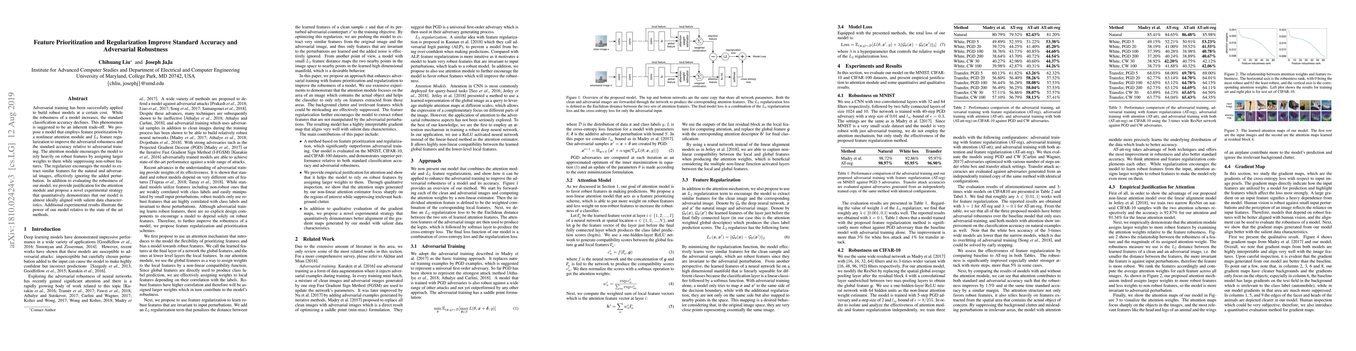 This paper proposes a model that uses feature prioritization and $L_2$ regularization to enhance both adversarial robustness and standard accuracy, addressing the trade-off inherent in adversarial training. The nonlinear attention module and regularizer focus on robust features and minimize the impact of adversarial perturbations.