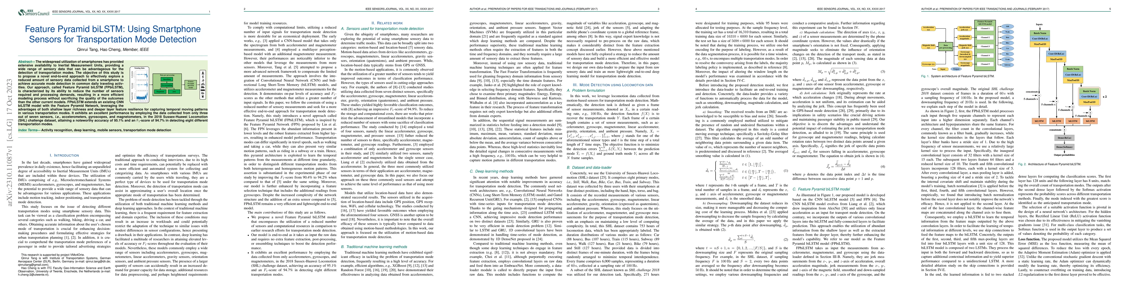 This paper proposes a Feature Pyramid biLSTM (FPbiLSTM) model to detect transportation modes using smartphone sensors, achieving high accuracy with minimal sensor data. The FPbiLSTM approach combines a Feature Pyramid Network with a biLSTM model, effectively utilizing data from just three sensors to attain 95.1% accuracy and an F1-score of 94.7% in the SHL challenge dataset.