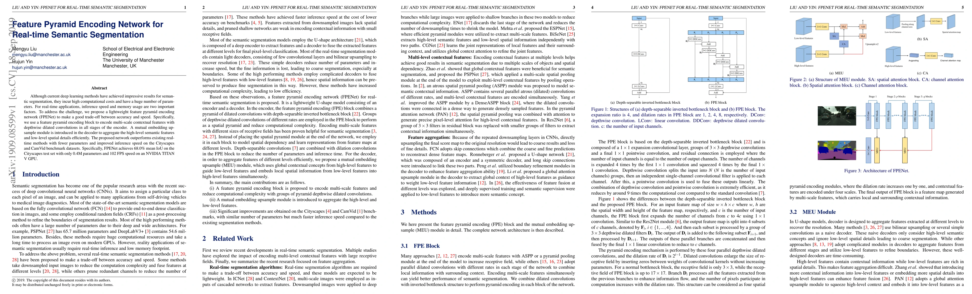 The paper proposes a lightweight feature pyramid encoding network (FPENet) for real-time semantic segmentation, balancing accuracy and speed by using multi-scale feature encoding and efficient upsampling. FPENet achieves high mean IoU with fewer parameters and faster inference speed on Cityscapes and CamVid datasets.