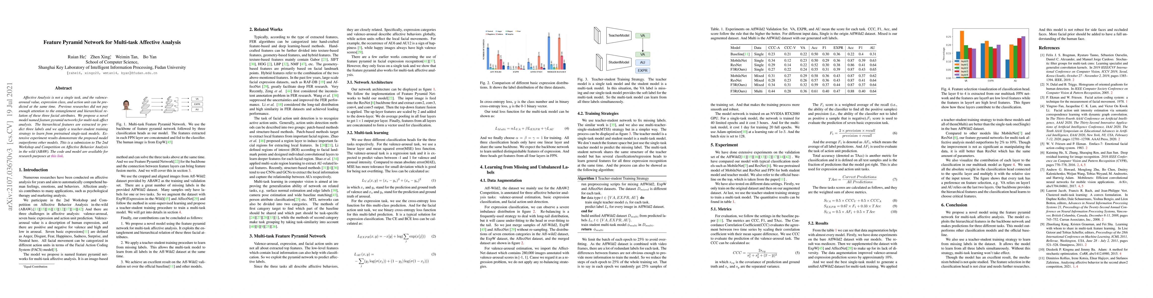 The paper proposes a Feature Pyramid Network for multi-task affective analysis to predict valence-arousal value, expression class, and action unit simultaneously. The model leverages hierarchical features and a teacher-student training strategy, outperforming other methods in extensive experiments.