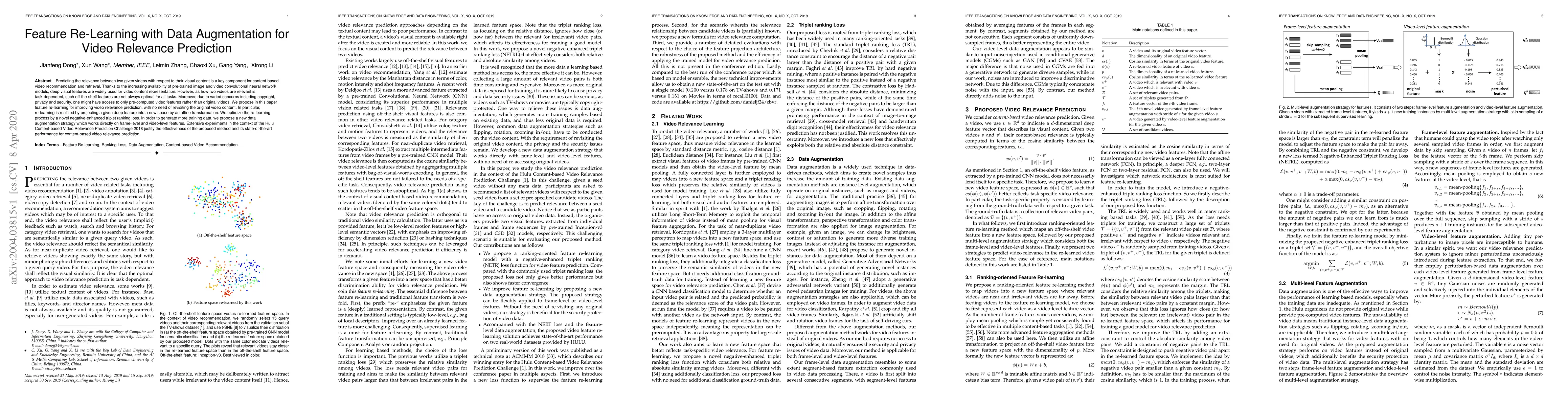 This paper proposes a method for improving video relevance prediction using feature re-learning and data augmentation without needing original video content. It employs an affine transformation for feature re-learning and a novel loss function to optimize the process, achieving state-of-the-art performance in the Hulu Content-based Video Relevance Prediction Challenge 2018.
