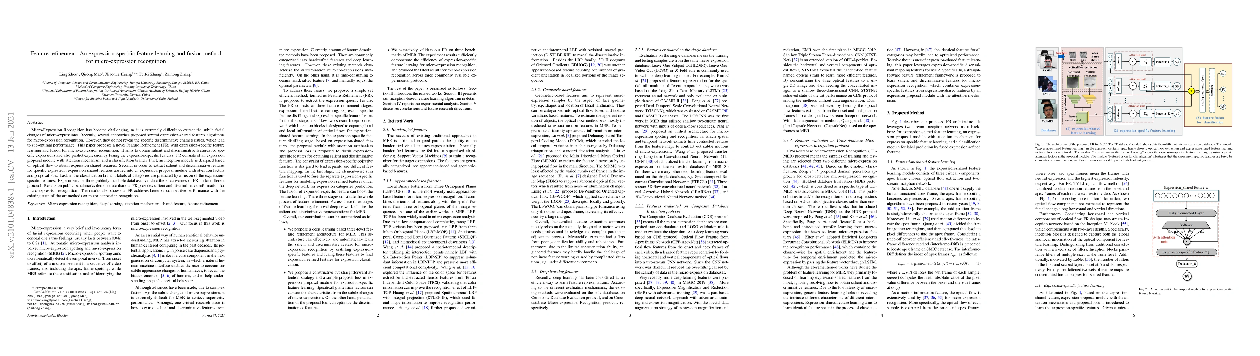 This paper introduces a novel Feature Refinement (FR) method for micro-expression recognition, which employs expression-specific feature learning and fusion to extract salient and discriminative features. The FR method combines an inception module for shared feature extraction, an expression proposal module with attention mechanisms, and a classification branch for optimal performance.