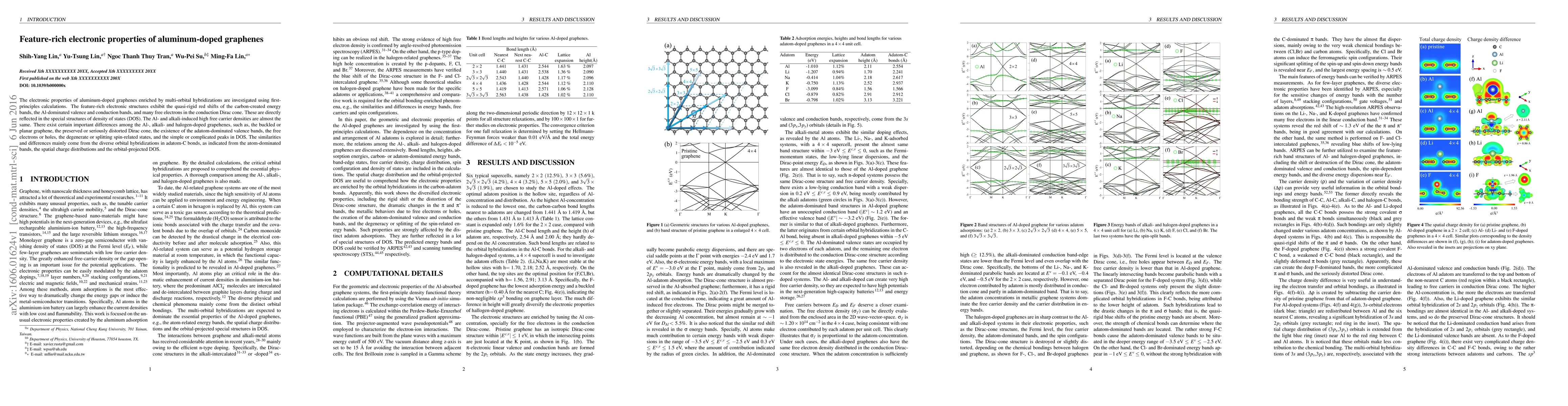 The electronic properties of aluminum-doped graphenes enriched by multi-orbital hybridizations are investigated using first-principles calculations. The feature-rich electronic structures exhibit the quasi-rigid red shifts of the carbon-created energy bands, the Al-dominated valence and conduction bands, and many free electrons in the conduction Dirac cone. These are directly reflected in the special structures of density of states (DOS). The Al- and alkali-induced high free carrier densities are almost the same. There exist certain important differences among the Al-, alkali- and halogen-doped grapehenes, such as, the buckled or planar graphene, the preserved or seriously distorted Dirac cone, the existence of the adatom-dominated valence bands, the free electrons or holes, the degenerate or splitting spin-related states, and the simple or complicated peaks in DOS. The similarities and differences mainly come from the diverse orbital hybridizations in adatom-C bonds, as indicated from the atom-dominated bands, the spatial charge distributions and the orbital-projected DOS.
