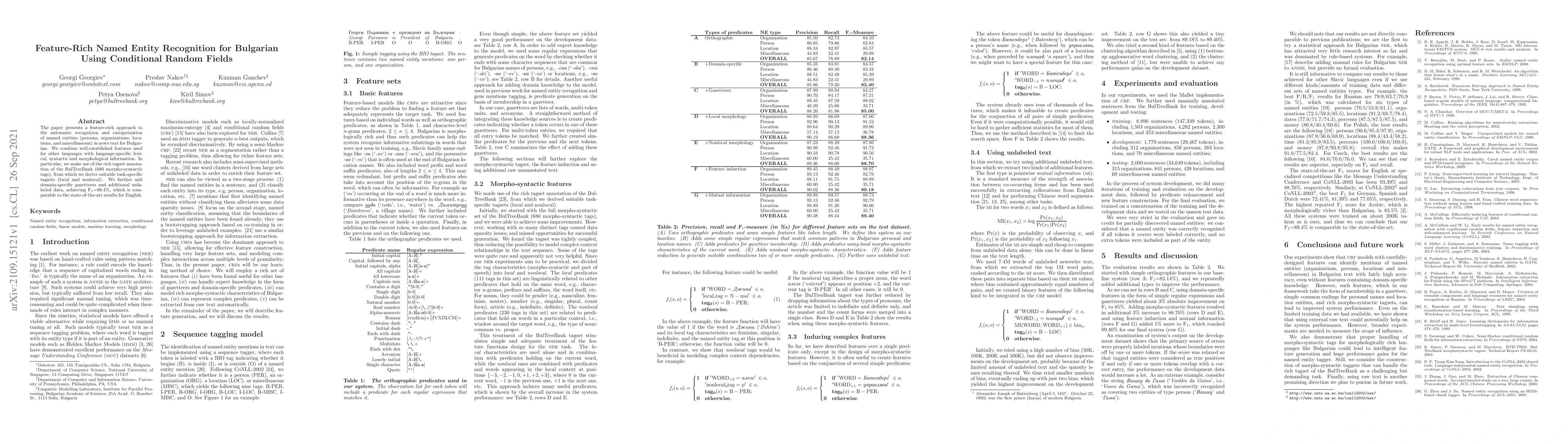 The paper presents a feature-rich approach to the automatic recognition and categorization of named entities (persons, organizations, locations, and miscellaneous) in news text for Bulgarian. We combine well-established features used for other languages with language-specific lexical, syntactic and morphological information. In particular, we make use of the rich tagset annotation of the BulTreeBank (680 morpho-syntactic tags), from which we derive suitable task-specific tagsets (local and nonlocal). We further add domain-specific gazetteers and additional unlabeled data, achieving F1=89.4%, which is comparable to the state-of-the-art results for English.