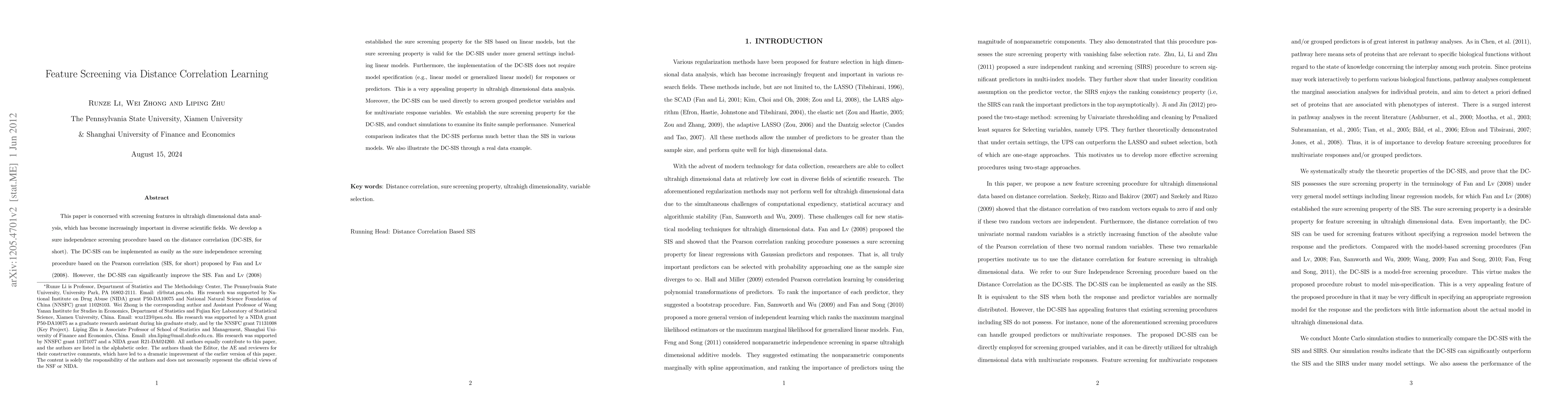 This paper introduces a new feature screening method called DC-SIS based on distance correlation, which outperforms the traditional SIS method by working under more general settings without requiring specific model specifications. Simulation results show superior performance of DC-SIS over SIS in various models, and it is demonstrated through a real data example.