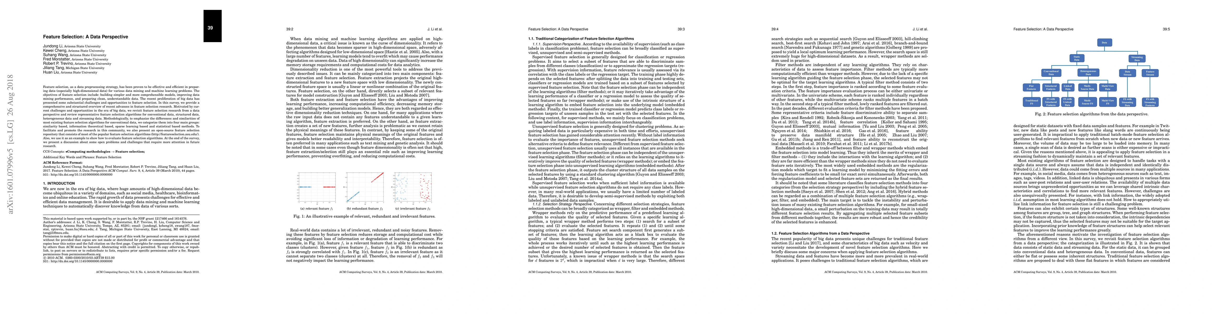 Feature selection, as a data preprocessing strategy, has been proven to be effective and efficient in preparing data (especially high-dimensional data) for various data mining and machine learning problems. The objectives of feature selection include: building simpler and more comprehensible models, improving data mining performance, and preparing clean, understandable data. The recent proliferation of big data has presented some substantial challenges and opportunities to feature selection. In this survey, we provide a comprehensive and structured overview of recent advances in feature selection research. Motivated by current challenges and opportunities in the era of big data, we revisit feature selection research from a data perspective and review representative feature selection algorithms for conventional data, structured data, heterogeneous data and streaming data. Methodologically, to emphasize the differences and similarities of most existing feature selection algorithms for conventional data, we categorize them into four main groups: similarity based, information theoretical based, sparse learning based and statistical based methods. To facilitate and promote the research in this community, we also present an open-source feature selection repository that consists of most of the popular feature selection algorithms (\url{http://featureselection.asu.edu/}). Also, we use it as an example to show how to evaluate feature selection algorithms. At the end of the survey, we present a discussion about some open problems and challenges that require more attention in future research.