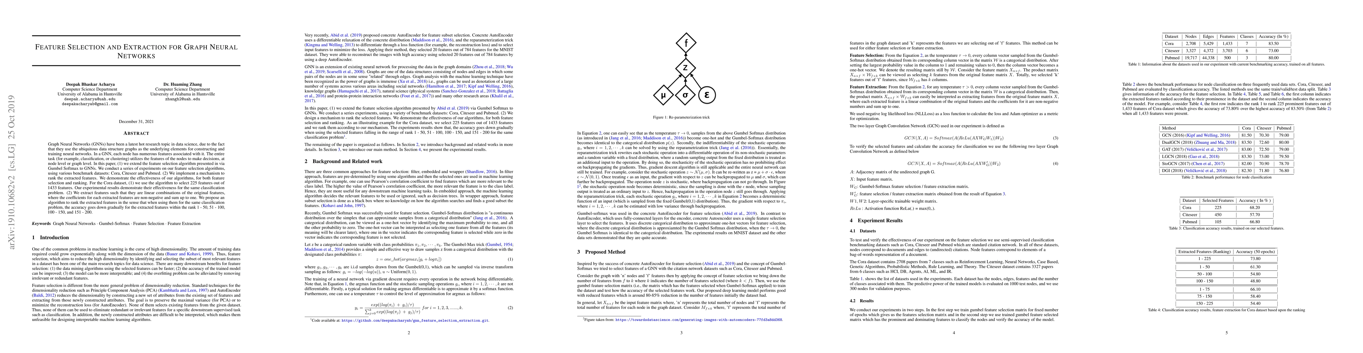 This paper explores feature selection and extraction for Graph Neural Networks (GNNs), extending a Gumbel Softmax-based feature selection algorithm to GNNs and ranking extracted features. Experiments on datasets like Cora, Citeseer, and Pubmed show that the selected features significantly improve classification performance, while the ranking mechanism demonstrates the effectiveness of the extracted features in maintaining accuracy.