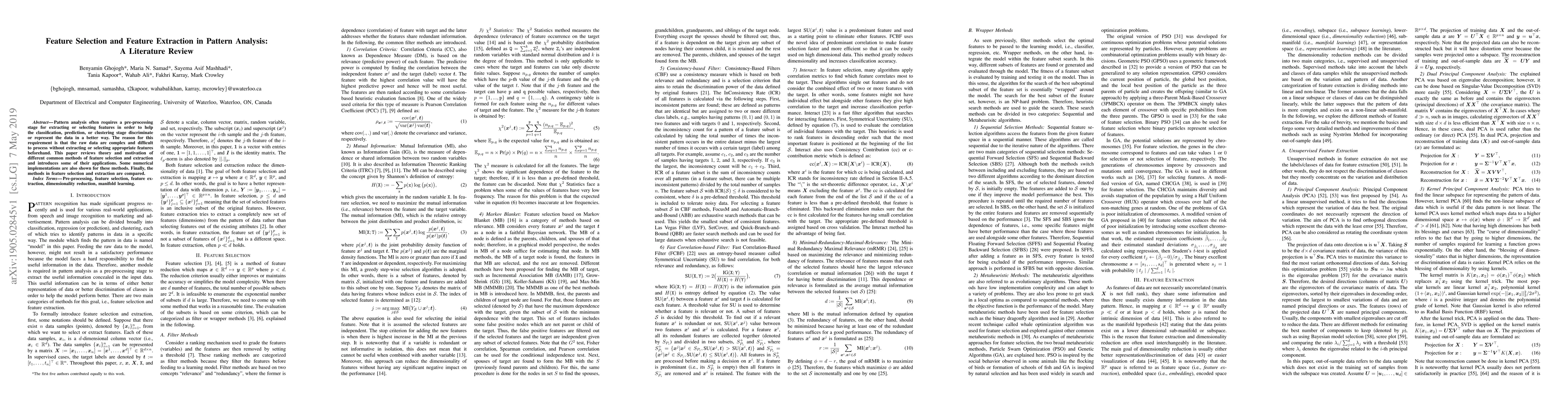 This paper reviews feature selection and extraction methods for pattern analysis, introducing common techniques and their applications, with a focus on comparing their effectiveness.