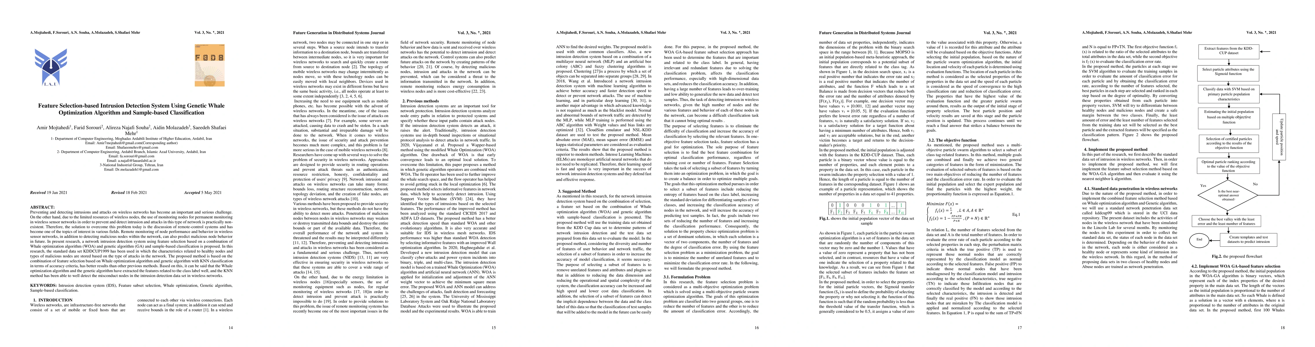 Preventing and detecting intrusions and attacks on wireless networks has become an important and serious challenge. On the other hand, due to the limited resources of wireless nodes, the use of monitoring nodes for permanent monitoring in wireless sensor networks in order to prevent and detect intrusion and attacks in this type of network is practically non-existent. Therefore, the solution to overcome this problem today is the discussion of remote-control systems and has become one of the topics of interest in various fields. Remote monitoring of node performance and behavior in wireless sensor networks, in addition to detecting malicious nodes within the network, can also predict malicious node behavior in future. In present research, a network intrusion detection system using feature selection based on a combination of Whale optimization algorithm (WOA) and genetic algorithm (GA) and sample-based classification is proposed. In this research, the standard data set KDDCUP1999 has been used in which the characteristics related to healthy nodes and types of malicious nodes are stored based on the type of attacks in the network. The proposed method is based on the combination of feature selection based on Whale optimization algorithm and genetic algorithm with KNN classification in terms of accuracy criteria, has better results than other previous methods. Based on this, it can be said that the Whale optimization algorithm and the genetic algorithm have extracted the features related to the class label well, and the KNN method has been able to well detect the misconduct nodes in the intrusion detection data set in wireless networks.