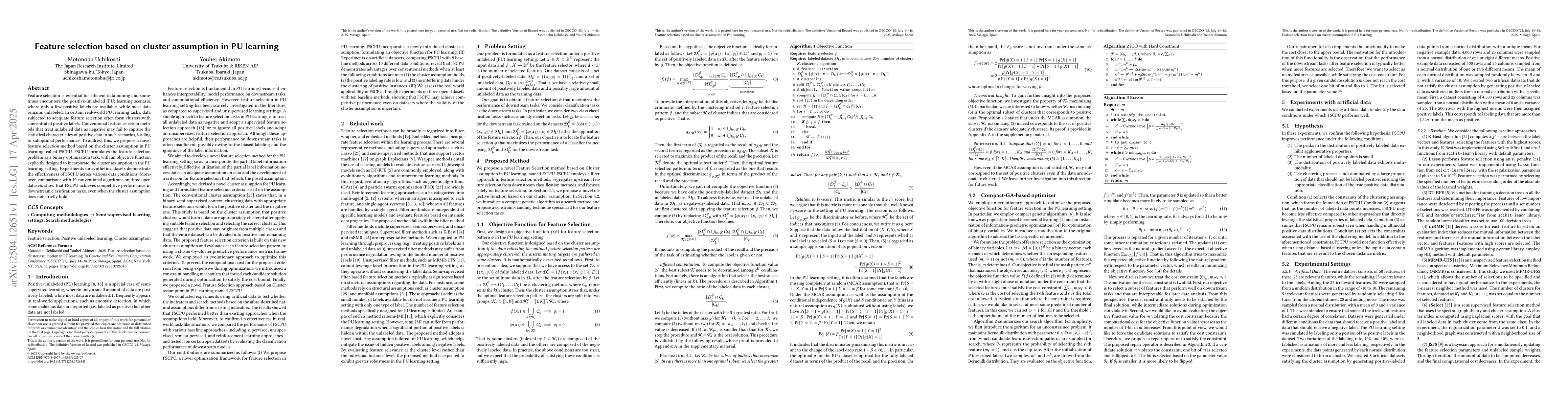 The paper proposes FSCPU, a feature selection method for Positive-Unlabeled (PU) learning based on the cluster assumption. It formulates the feature selection problem as a binary optimization task, optimizing an objective function that incorporates the cluster assumption.
