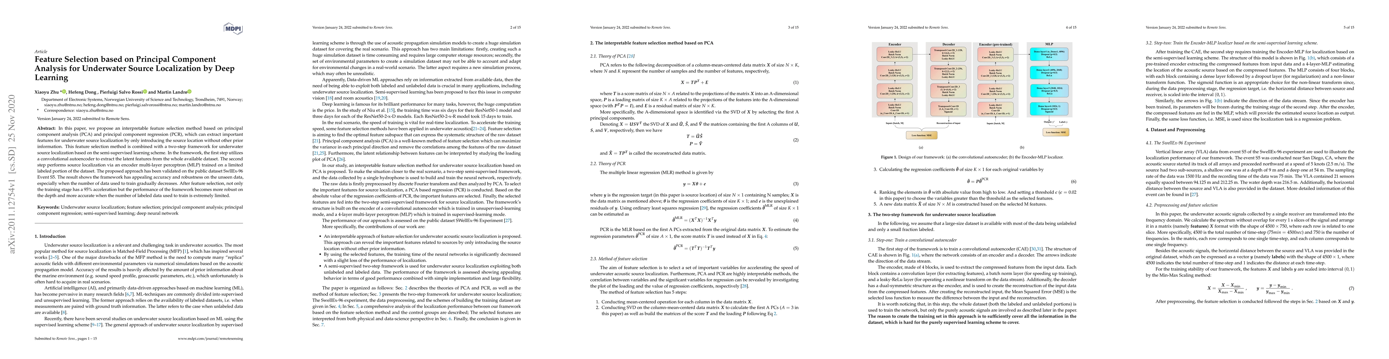 This paper presents a method using Principal Component Analysis (PCA) and semi-supervised learning for underwater source localization. The approach, validated on SwllEx-96 Event S5 dataset, significantly accelerates training (95% faster) and enhances robustness and accuracy, especially with limited labeled data.