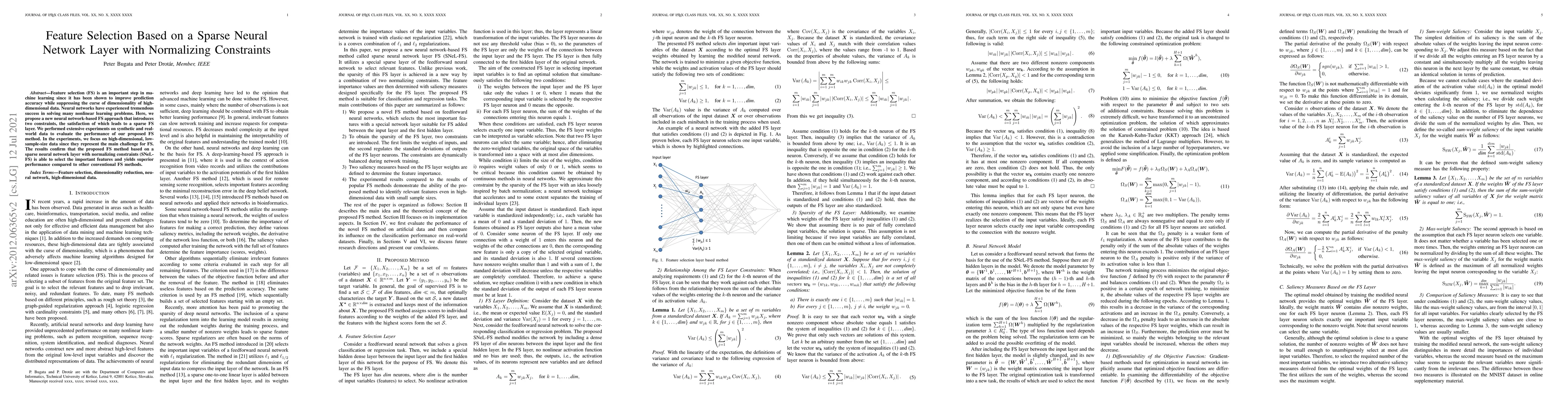 Feature selection is important step in machine learning since it has shown to improve prediction accuracy while depressing the curse of dimensionality of high dimensional data. The neural networks have experienced tremendous success in solving many nonlinear learning problems. Here, we propose new neural-network based feature selection approach that introduces two constrains, the satisfying of which leads to sparse FS layer. We have performed extensive experiments on synthetic and real world data to evaluate performance of the proposed FS. In experiments we focus on the high dimension, low sample size data since those represent the main challenge for feature selection. The results confirm that proposed Feature Selection Based on Sparse Neural Network Layer with Normalizing Constraints (SNEL-FS) is able to select the important features and yields superior performance compared to other conventional FS methods.