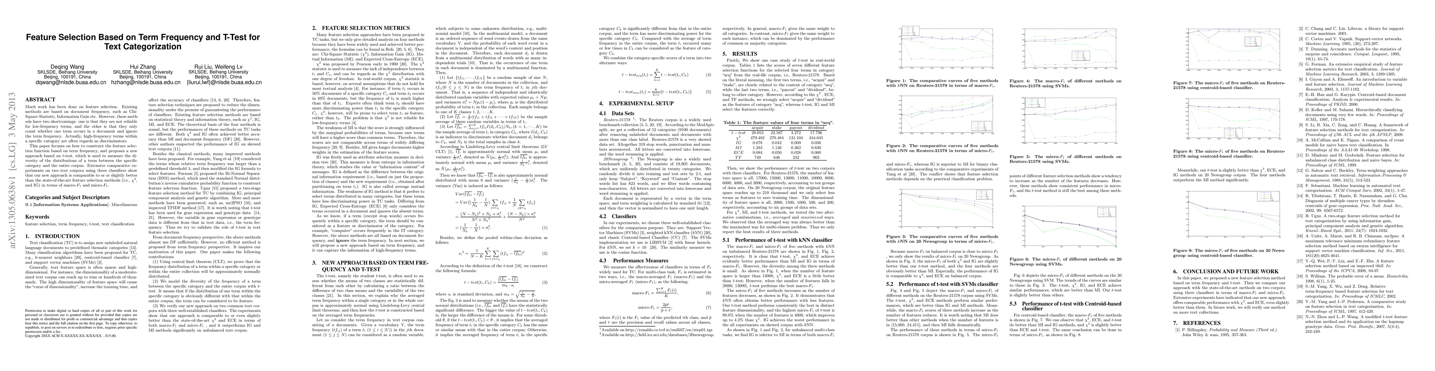 A new feature selection approach based on term frequency and $t$-test improves text categorization accuracy compared to state-of-the-art methods like Chi-Square Statistic and Information Gain.