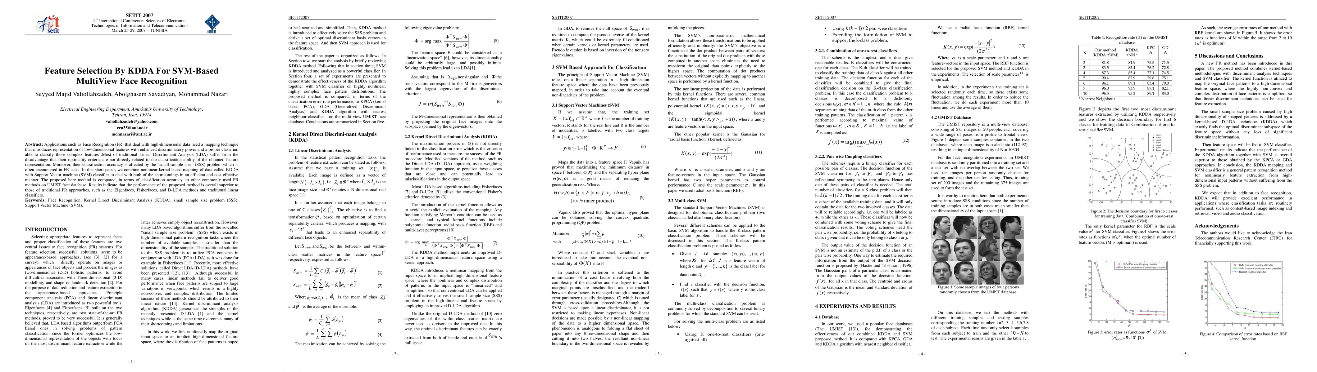 A new method combines KDDA with SVM for face recognition, outperforming traditional methods in classification accuracy and addressing small sample size issues.
