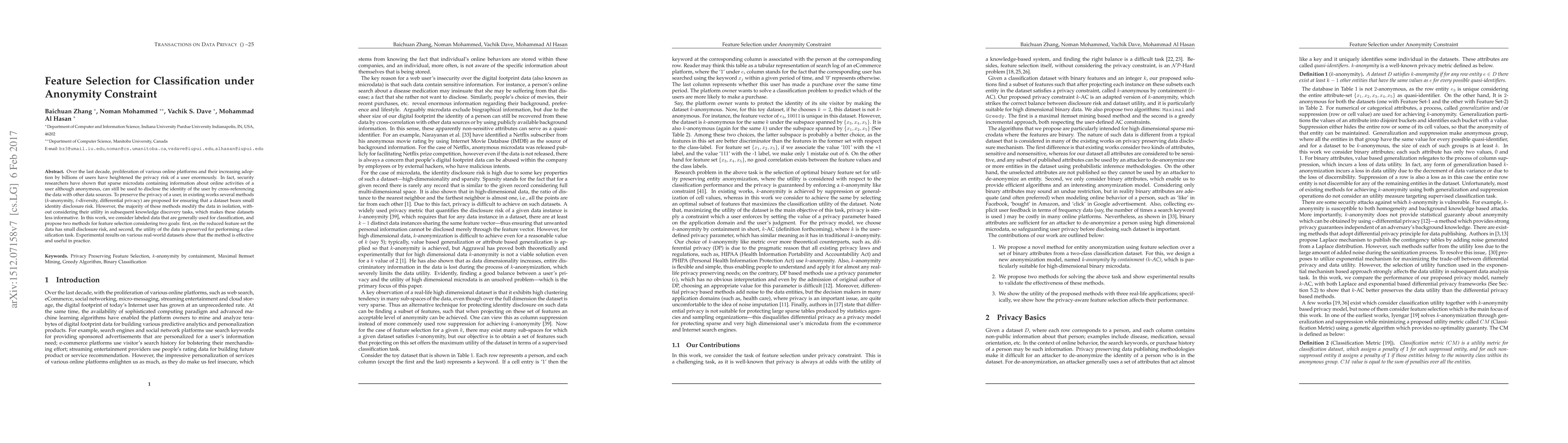 Over the last decade, proliferation of various online platforms and their increasing adoption by billions of users have heightened the privacy risk of a user enormously. In fact, security researchers have shown that sparse microdata containing information about online activities of a user although anonymous, can still be used to disclose the identity of the user by cross-referencing the data with other data sources. To preserve the privacy of a user, in existing works several methods (k-anonymity, l-diversity, differential privacy) are proposed that ensure a dataset which is meant to share or publish bears small identity disclosure risk. However, the majority of these methods modify the data in isolation, without considering their utility in subsequent knowledge discovery tasks, which makes these datasets less informative. In this work, we consider labeled data that are generally used for classification, and propose two methods for feature selection considering two goals: first, on the reduced feature set the data has small disclosure risk, and second, the utility of the data is preserved for performing a classification task. Experimental results on various real-world datasets show that the method is effective and useful in practice.
