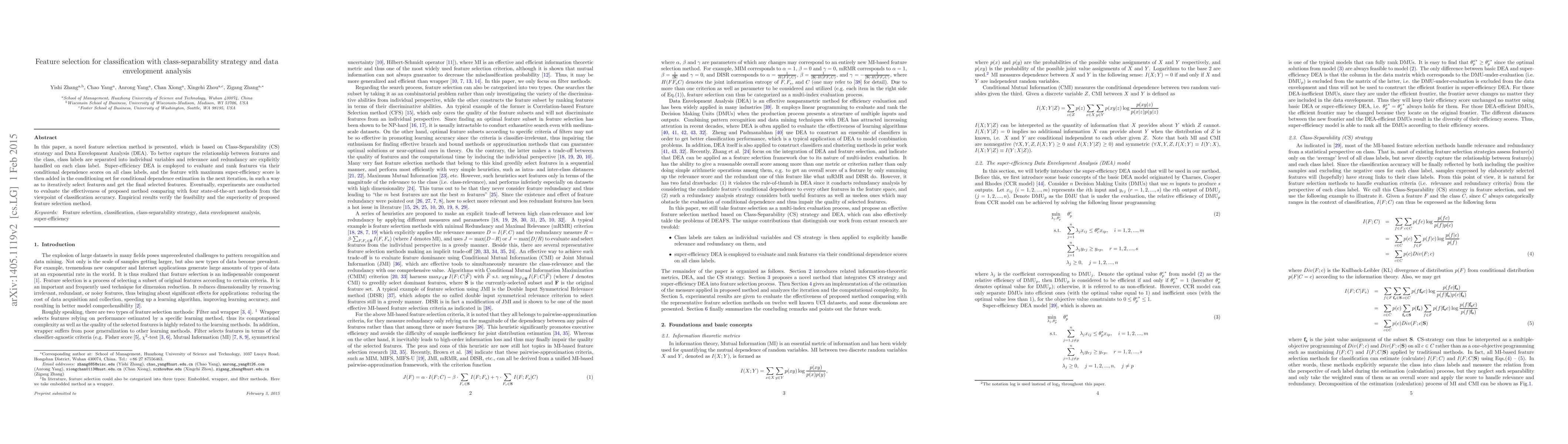 This paper introduces a novel feature selection method combining Class-Separability strategy and Data Envelopment Analysis (DEA). It iteratively selects features based on their conditional dependence scores on class labels, employing super-efficiency DEA for ranking, and demonstrates superior classification accuracy compared to four state-of-the-art methods.