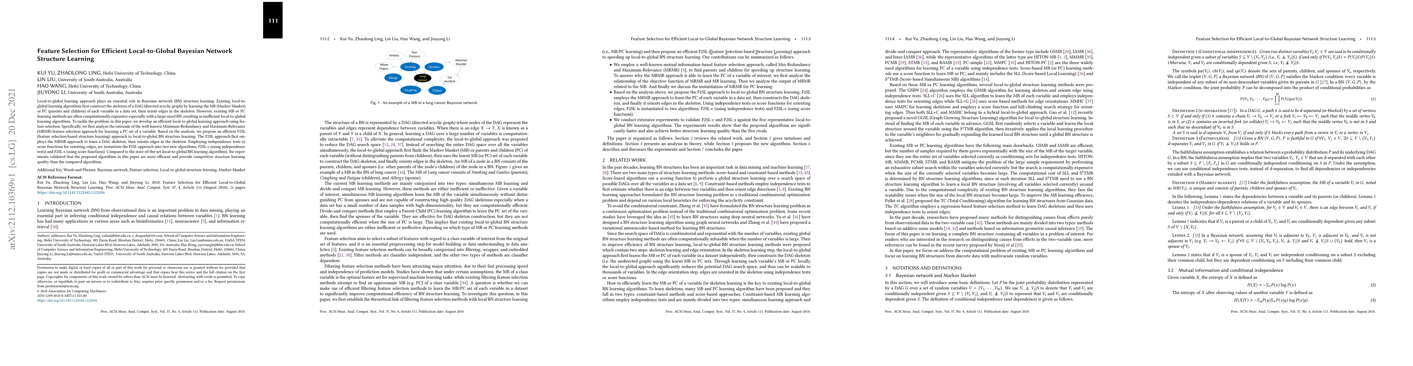 This paper proposes an efficient local-to-global Bayesian network structure learning approach using feature selection, specifically employing the Minimum-Redundancy and Maximum-Relevance (MRMR) method. The developed F2SL approach constructs a DAG skeleton and orients edges, resulting in two new algorithms, F2SL-c and F2SL-s, which outperform existing methods in computational efficiency while maintaining competitive learning quality.